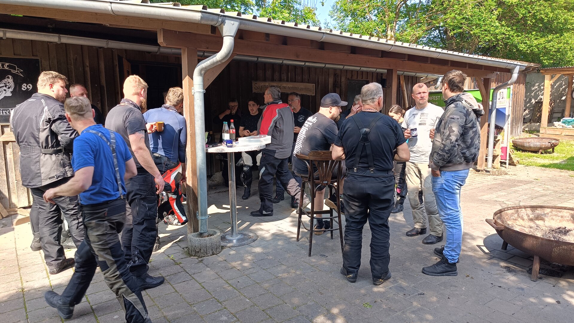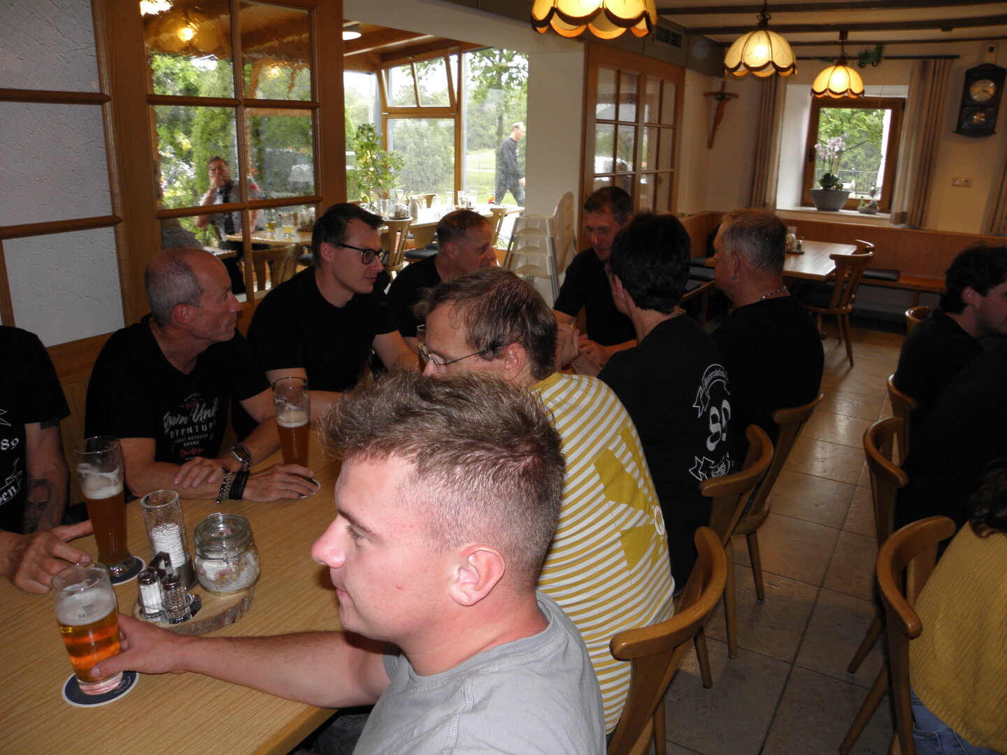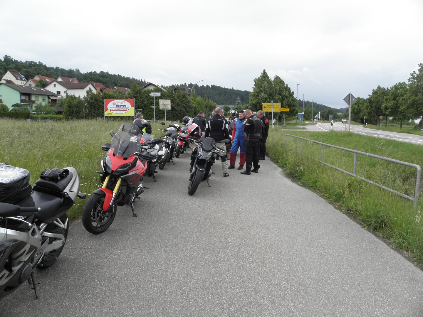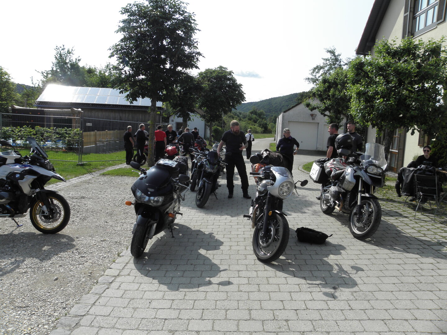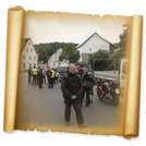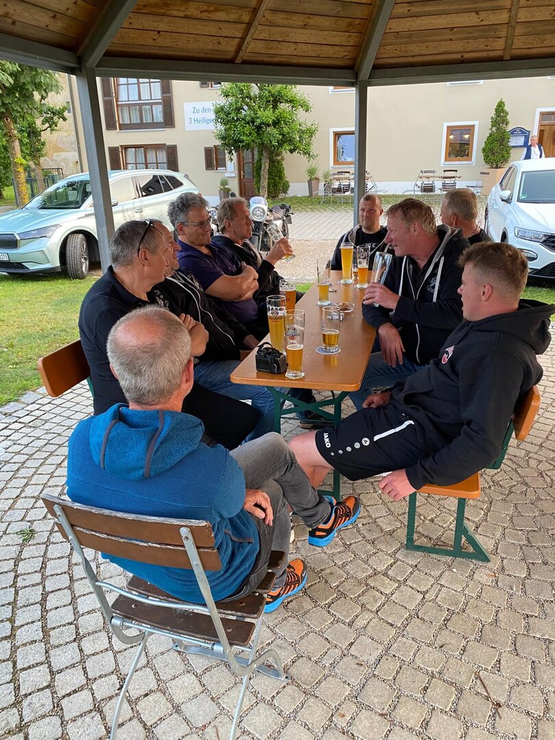 Am 7. Juni gings wieder los es stand die Pfingstausfahrt auf dem Programm. Ziel war dieses mal der Gasthof "Zu den drei Heiligen " in Dietfurt an der Altmühl. Bei durchwachsenem Wetter gings morgens mit 23 Motorräder los. Die Tour ging über Blaubeuren, Dornstadt, Beimerstetten, Heuchlingen, Hermaringen, Sachsenhausen, Dischingen, Amerdingen, Harburg, Flotzheim, nach Pappenheim wo getankt wurde. Dort fing es an zu regnen und die Strecke über Eichtätt, Kinding, Beilngries nach Griesstetten wurde im Regen absolviert. Zum Teil Nass angekommen wurden die Zimmer bezogen, warm geduscht und sich erst einmal ein kühles Blondes gegönnt. Nach einem tollen Essen wollten einige noch auf einFest in der Nähe und organisierte ein Großraumtaxi. Man staunte nicht schlecht als statt dem Taxi ein Reisebus ankam. Mit dem fuhren einige aufs Fest, das ältere Semester blieb im Gasthof und lies es dort ausklingen. Nach reichhaltigem Frühstück und abkühlung in der Altmühl ging es auf zu einer Rundtour Man fuhr über Beratzhausen, Burglengenfeld, Amberg. Kurz vor Amberg mussten wir zwecks Unwetter unterstehen. Von oben trocken gings weiter nach Hirschau, Hahnbach, Kalchsreuth, nach Pruihausen wo im Gasthof Jägerheim Mittag gemacht wurde. Nach gutem Essen fuhr man dann über Neuhaus an der Pegnitz Richtung Happurg. In der Mitte der Strecke wurden wir noch von dem Verkehrszug der Polizei angehalten, Fahrzeugkontrolle usw. stand auf dem Plan. Wir waren wahrscheinlich die einzigen Motorradfahrer an diesem Tag da sonst bei diesem Wetter keiner sein Bike herausholte. Nach einer halben Stunde ging wieder weiter nach Laaber, Mittersthal, Stauferbuch, zurück nach Griesstetten wo man den Abend bei Speis und Trank ausklingen lies. Einige machten noch einen Spaziergang zur Wahlfahrtskirche "zu den drei elend Heiligen". Gestärkt am morgen bei besserem Wetter gings zurück über Beilngries, Weißenburg in Bayern, Wassertrüdingen, Unterschneidheim, Oberkochen, Lonsee, Blaubeuren zurück ins Clubheim wo es noch Kaffee und Kuchen gab. Es waren mal wieder 3 tolle Tage bis nächstes Jahr.