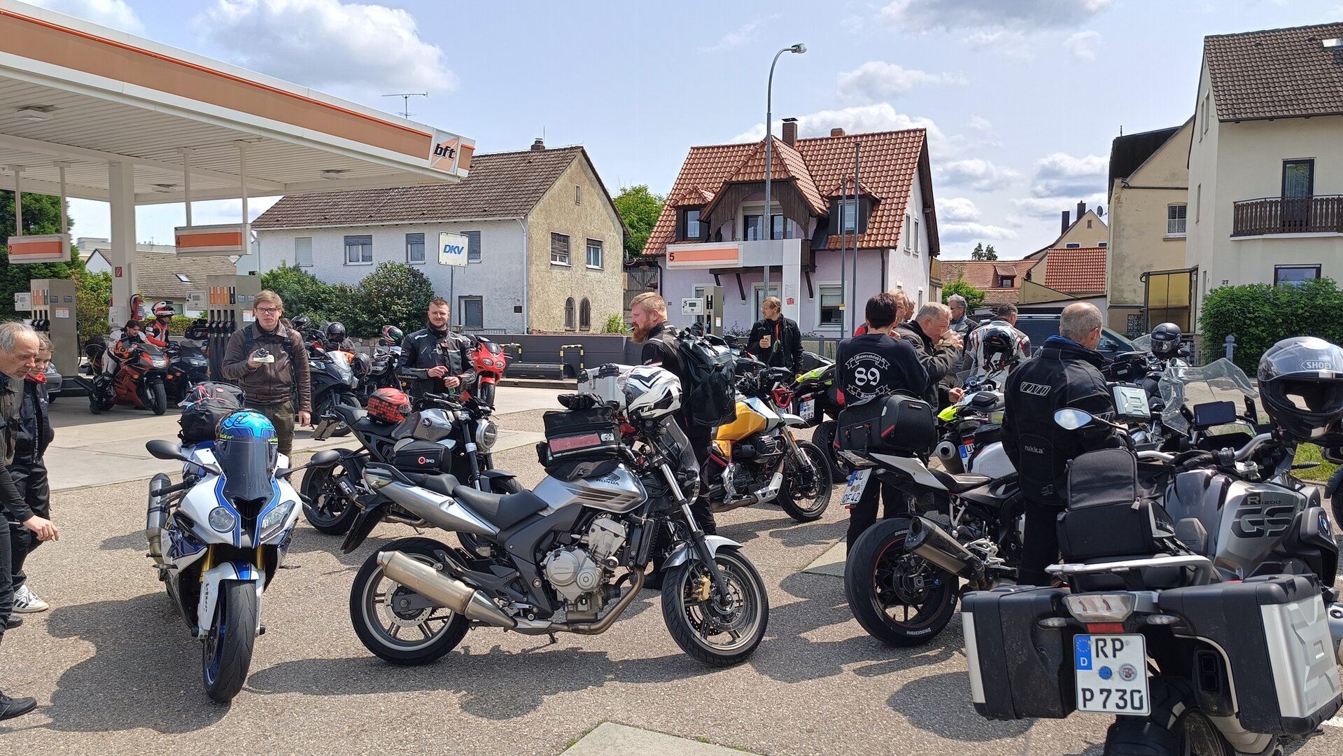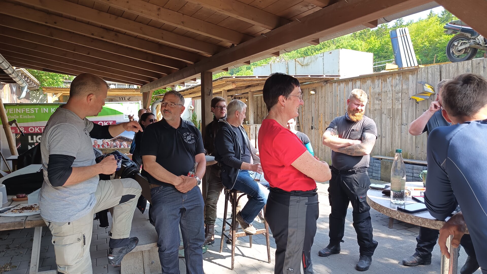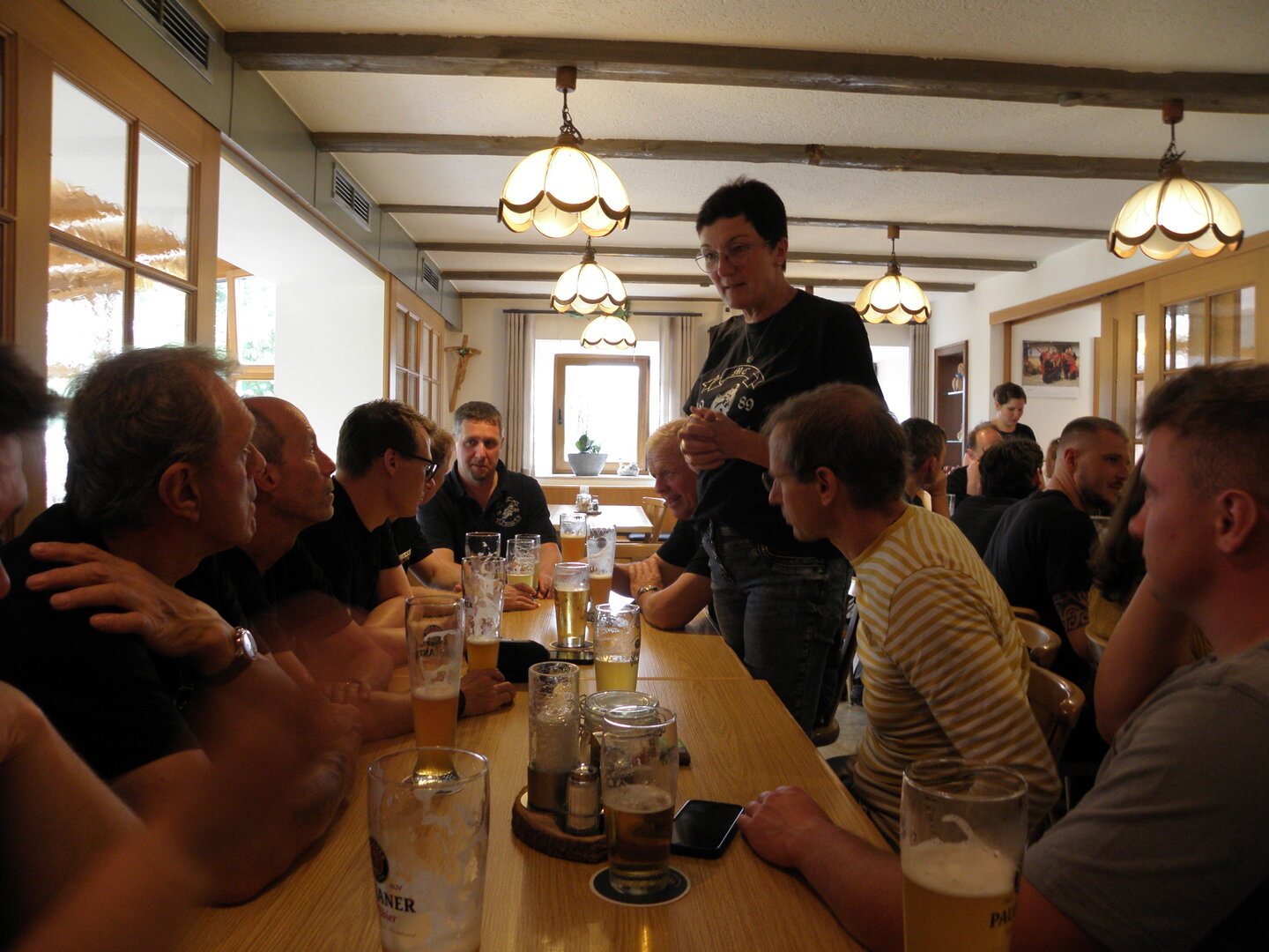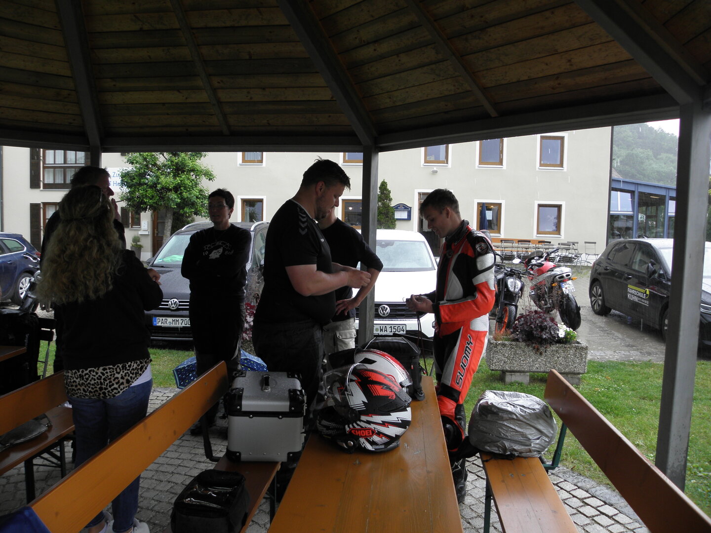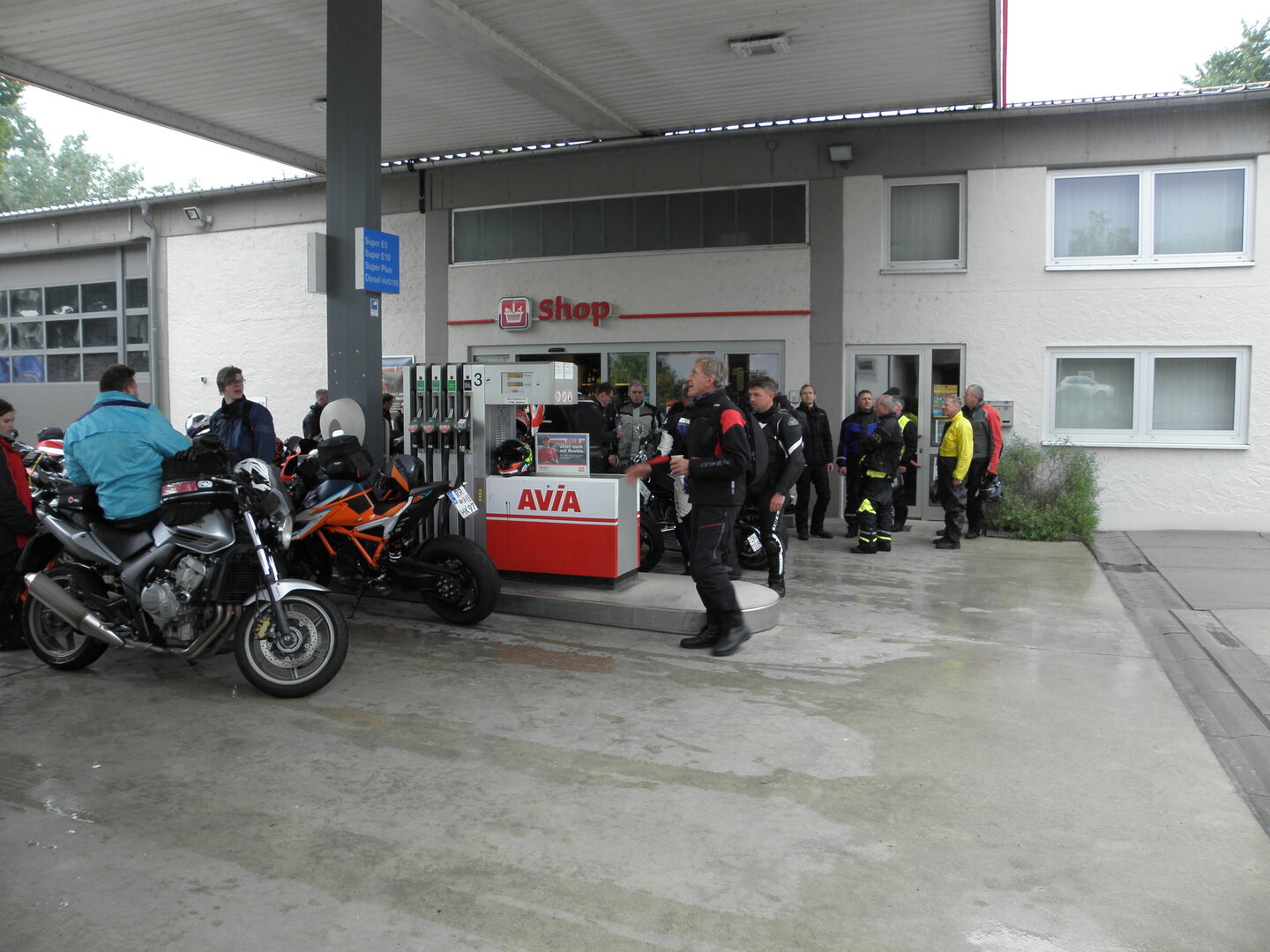 Am 7. Juni gings wieder los es stand die Pfingstausfahrt auf dem Programm. Ziel war dieses mal der Gasthof "Zu den drei Heiligen " in Dietfurt an der Altmühl. Bei durchwachsenem Wetter gings morgens mit 23 Motorräder los. Die Tour ging über Blaubeuren, Dornstadt, Beimerstetten, Heuchlingen, Hermaringen, Sachsenhausen, Dischingen, Amerdingen, Harburg, Flotzheim, nach Pappenheim wo getankt wurde. Dort fing es an zu regnen und die Strecke über Eichtätt, Kinding, Beilngries nach Griesstetten wurde im Regen absolviert. Zum Teil Nass angekommen wurden die Zimmer bezogen, warm geduscht und sich erst einmal ein kühles Blondes gegönnt. Nach einem tollen Essen wollten einige noch auf einFest in der Nähe und organisierte ein Großraumtaxi. Man staunte nicht schlecht als statt dem Taxi ein Reisebus ankam. Mit dem fuhren einige aufs Fest, das ältere Semester blieb im Gasthof und lies es dort ausklingen. Nach reichhaltigem Frühstück und abkühlung in der Altmühl ging es auf zu einer Rundtour Man fuhr über Beratzhausen, Burglengenfeld, Amberg. Kurz vor Amberg mussten wir zwecks Unwetter unterstehen. Von oben trocken gings weiter nach Hirschau, Hahnbach, Kalchsreuth, nach Pruihausen wo im Gasthof Jägerheim Mittag gemacht wurde. Nach gutem Essen fuhr man dann über Neuhaus an der Pegnitz Richtung Happurg. In der Mitte der Strecke wurden wir noch von dem Verkehrszug der Polizei angehalten, Fahrzeugkontrolle usw. stand auf dem Plan. Wir waren wahrscheinlich die einzigen Motorradfahrer an diesem Tag da sonst bei diesem Wetter keiner sein Bike herausholte. Nach einer halben Stunde ging wieder weiter nach Laaber, Mittersthal, Stauferbuch, zurück nach Griesstetten wo man den Abend bei Speis und Trank ausklingen lies. Einige machten noch einen Spaziergang zur Wahlfahrtskirche "zu den drei elend Heiligen". Gestärkt am morgen bei besserem Wetter gings zurück über Beilngries, Weißenburg in Bayern, Wassertrüdingen, Unterschneidheim, Oberkochen, Lonsee, Blaubeuren zurück ins Clubheim wo es noch Kaffee und Kuchen gab. Es waren mal wieder 3 tolle Tage bis nächstes Jahr.