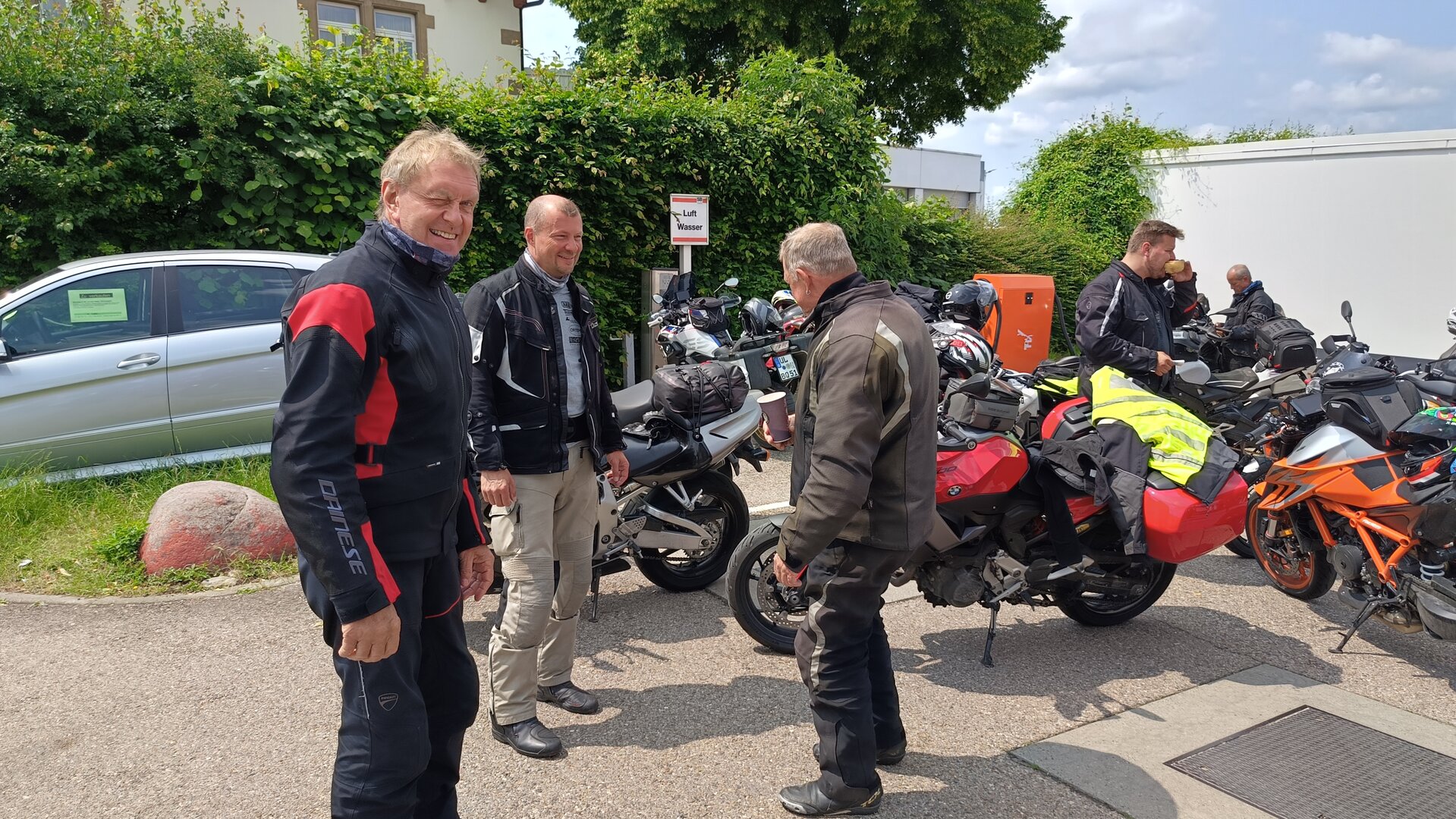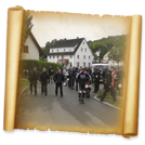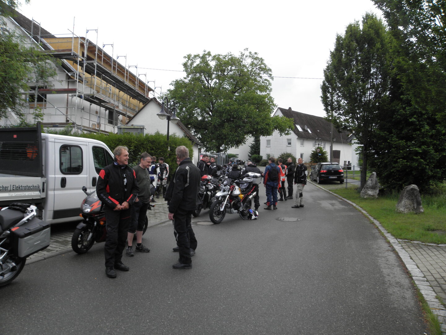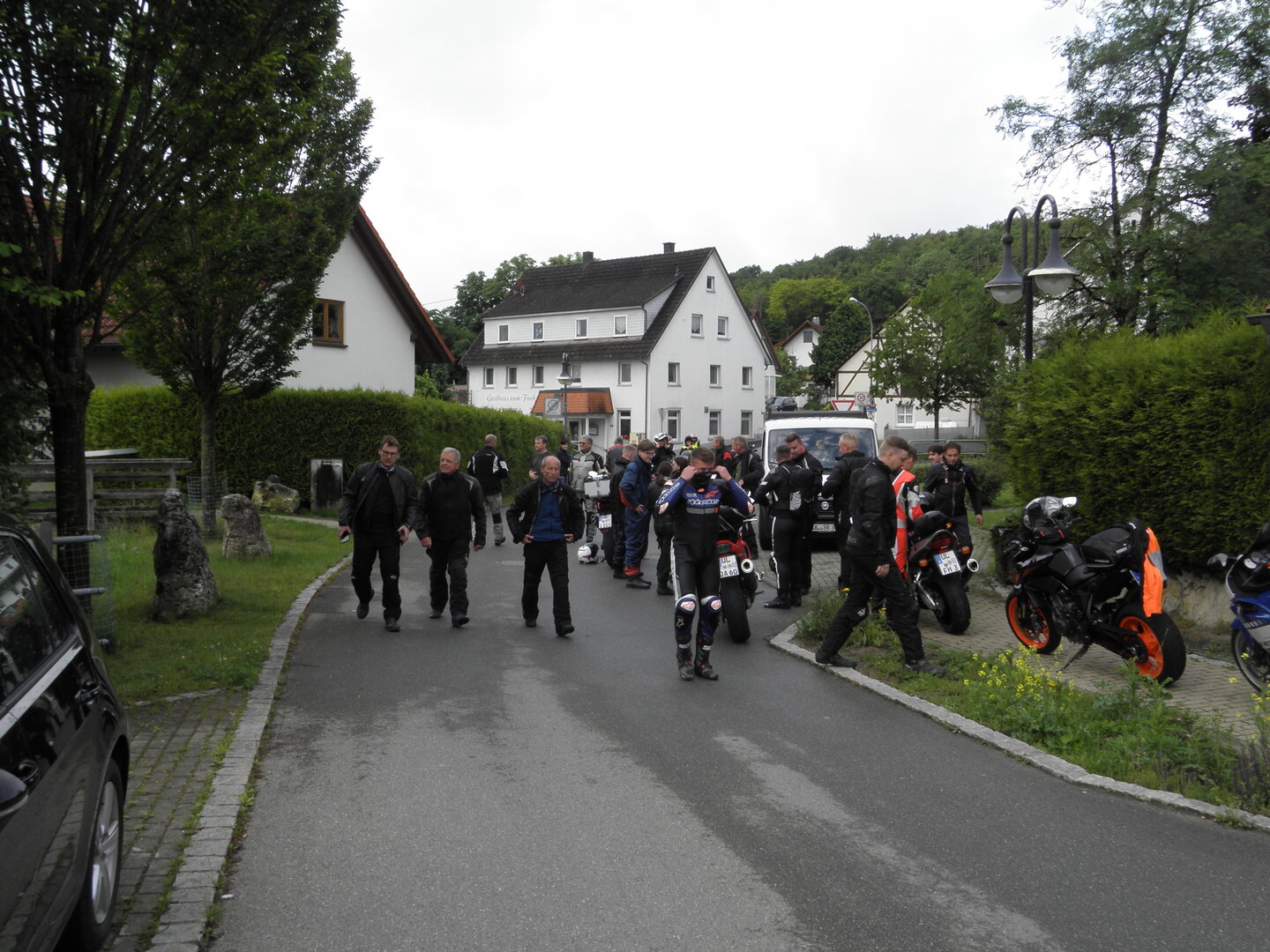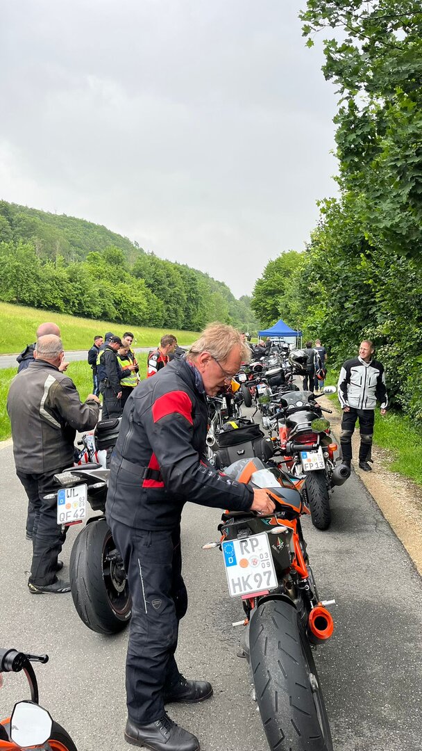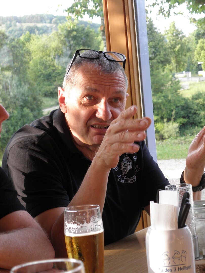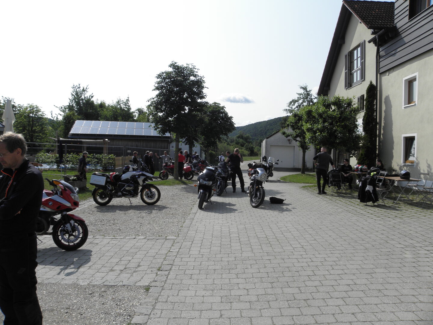Am 7. Juni gings wieder los es stand die Pfingstausfahrt auf dem Programm. Ziel war dieses mal der Gasthof "Zu den drei Heiligen " in Dietfurt an der Altmühl. Bei durchwachsenem Wetter gings morgens mit 23 Motorräder los. Die Tour ging über Blaubeuren, Dornstadt, Beimerstetten, Heuchlingen, Hermaringen, Sachsenhausen, Dischingen, Amerdingen, Harburg, Flotzheim, nach Pappenheim wo getankt wurde. Dort fing es an zu regnen und die Strecke über Eichtätt, Kinding, Beilngries nach Griesstetten wurde im Regen absolviert. Zum Teil Nass angekommen wurden die Zimmer bezogen, warm geduscht und sich erst einmal ein kühles Blondes gegönnt. Nach einem tollen Essen wollten einige noch auf einFest in der Nähe und organisierte ein Großraumtaxi. Man staunte nicht schlecht als statt dem Taxi ein Reisebus ankam. Mit dem fuhren einige aufs Fest, das ältere Semester blieb im Gasthof und lies es dort ausklingen. Nach reichhaltigem Frühstück und abkühlung in der Altmühl ging es auf zu einer Rundtour Man fuhr über Beratzhausen, Burglengenfeld, Amberg. Kurz vor Amberg mussten wir zwecks Unwetter unterstehen. Von oben trocken gings weiter nach Hirschau, Hahnbach, Kalchsreuth, nach Pruihausen wo im Gasthof Jägerheim Mittag gemacht wurde. Nach gutem Essen fuhr man dann über Neuhaus an der Pegnitz Richtung Happurg. In der Mitte der Strecke wurden wir noch von dem Verkehrszug der Polizei angehalten, Fahrzeugkontrolle usw. stand auf dem Plan. Wir waren wahrscheinlich die einzigen Motorradfahrer an diesem Tag da sonst bei diesem Wetter keiner sein Bike herausholte. Nach einer halben Stunde ging wieder weiter nach Laaber, Mittersthal, Stauferbuch, zurück nach Griesstetten wo man den Abend bei Speis und Trank ausklingen lies. Einige machten noch einen Spaziergang zur Wahlfahrtskirche "zu den drei elend Heiligen". Gestärkt am morgen bei besserem Wetter gings zurück über Beilngries, Weißenburg in Bayern, Wassertrüdingen, Unterschneidheim, Oberkochen, Lonsee, Blaubeuren zurück ins Clubheim wo es noch Kaffee und Kuchen gab. Es waren mal wieder 3 tolle Tage bis nächstes Jahr.