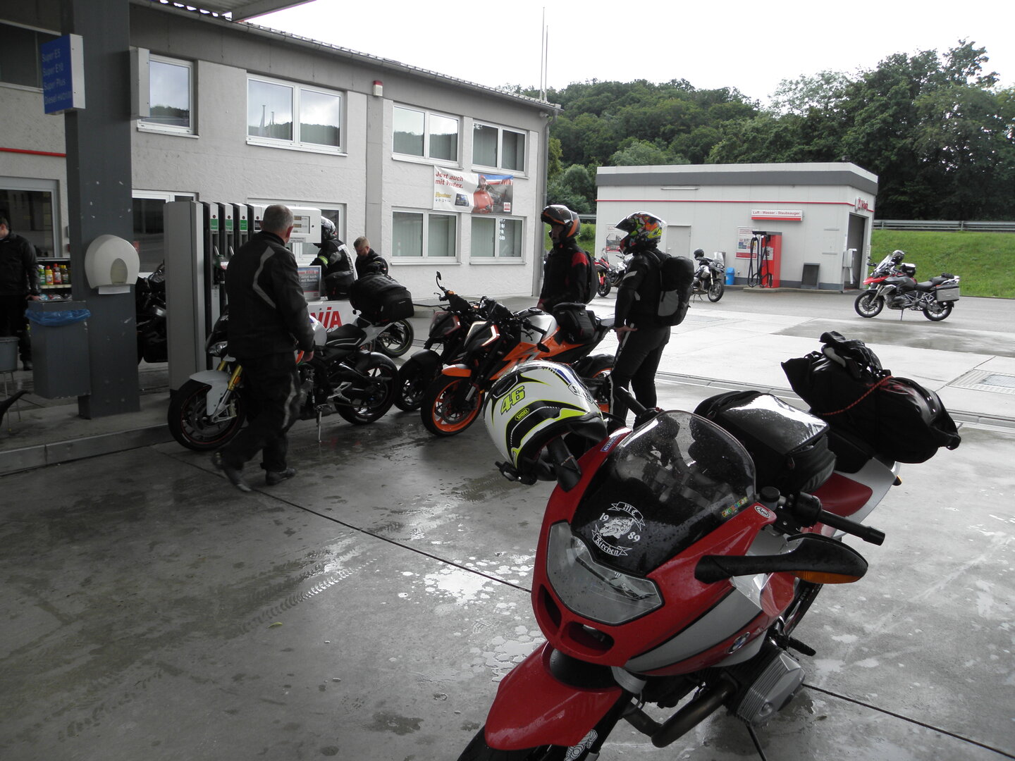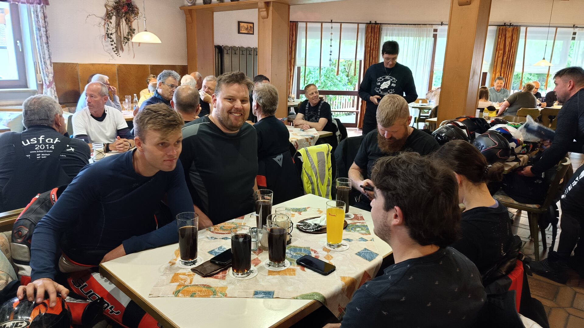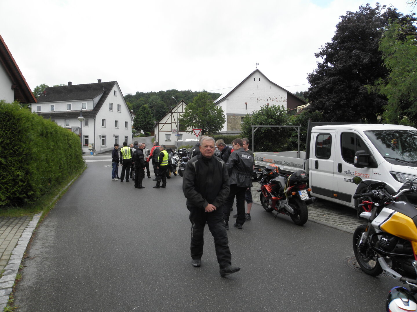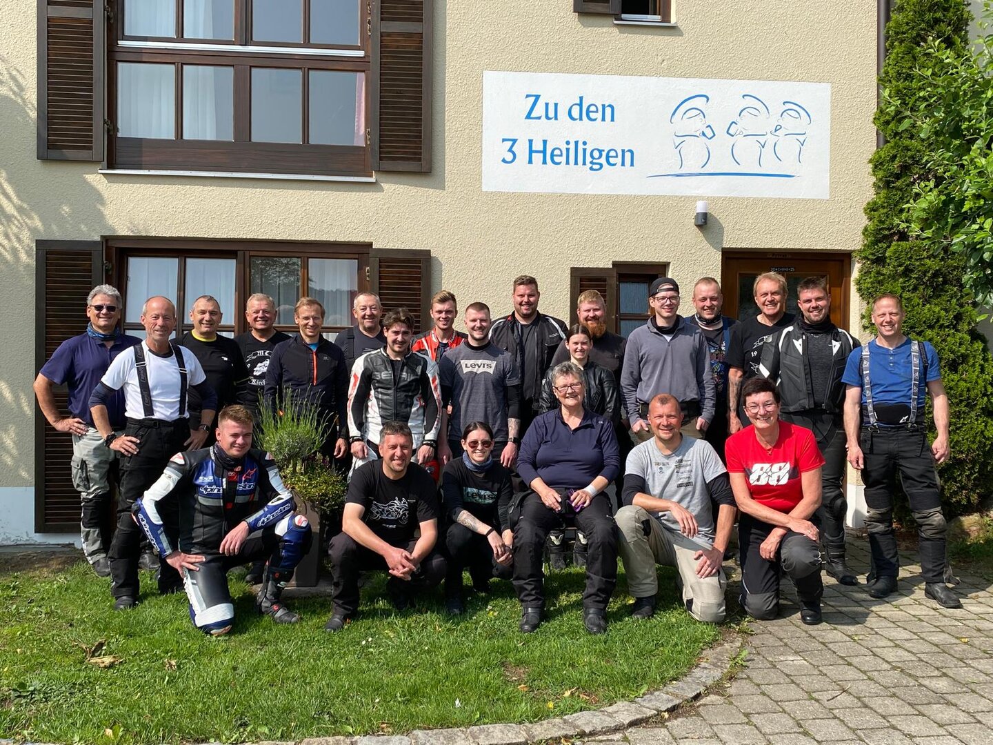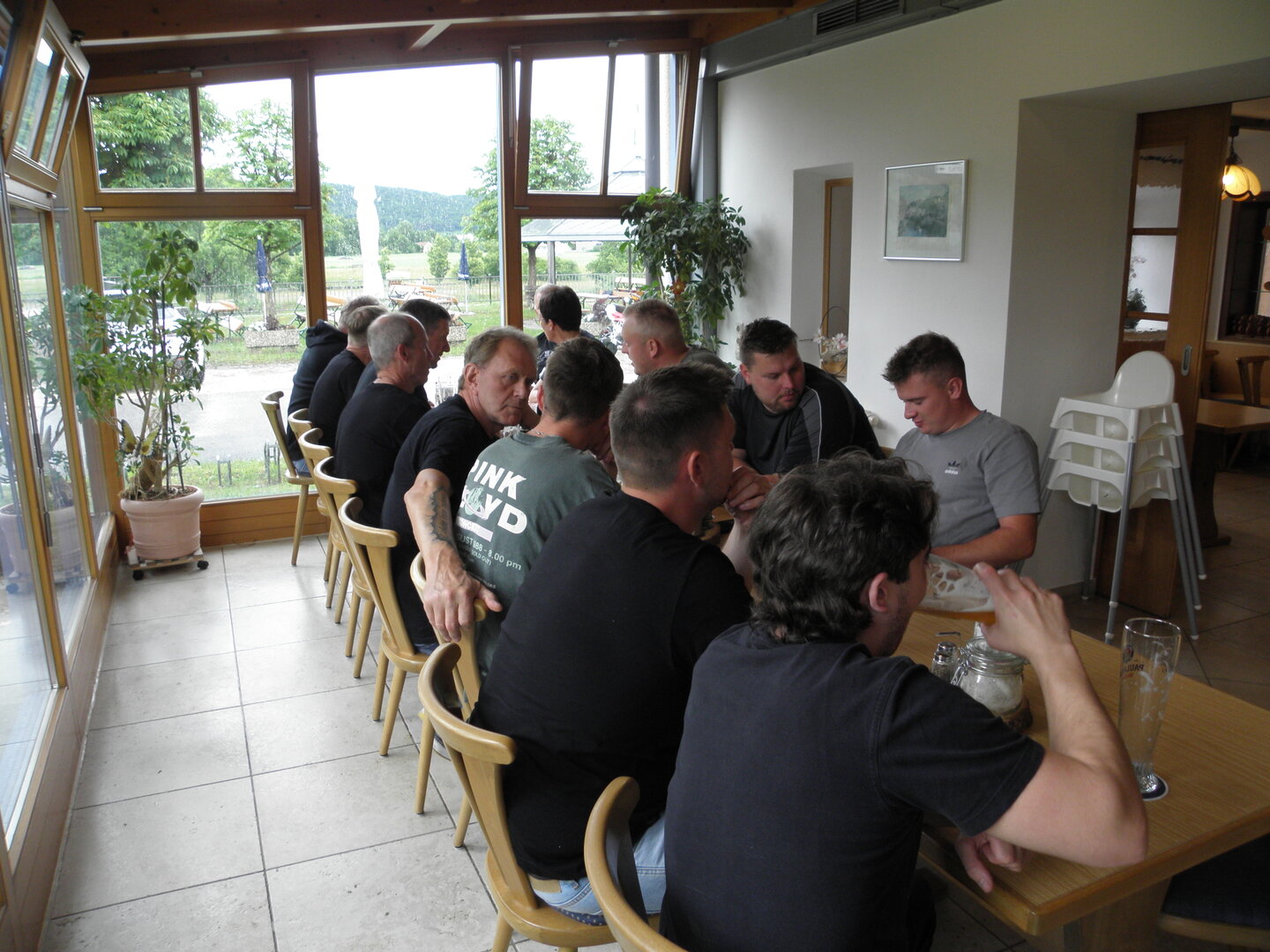 Am 7. Juni gings wieder los es stand die Pfingstausfahrt auf dem Programm. Ziel war dieses mal der Gasthof "Zu den drei Heiligen " in Dietfurt an der Altmühl. Bei durchwachsenem Wetter gings morgens mit 23 Motorräder los. Die Tour ging über Blaubeuren, Dornstadt, Beimerstetten, Heuchlingen, Hermaringen, Sachsenhausen, Dischingen, Amerdingen, Harburg, Flotzheim, nach Pappenheim wo getankt wurde. Dort fing es an zu regnen und die Strecke über Eichtätt, Kinding, Beilngries nach Griesstetten wurde im Regen absolviert. Zum Teil Nass angekommen wurden die Zimmer bezogen, warm geduscht und sich erst einmal ein kühles Blondes gegönnt. Nach einem tollen Essen wollten einige noch auf einFest in der Nähe und organisierte ein Großraumtaxi. Man staunte nicht schlecht als statt dem Taxi ein Reisebus ankam. Mit dem fuhren einige aufs Fest, das ältere Semester blieb im Gasthof und lies es dort ausklingen. Nach reichhaltigem Frühstück und abkühlung in der Altmühl ging es auf zu einer Rundtour Man fuhr über Beratzhausen, Burglengenfeld, Amberg. Kurz vor Amberg mussten wir zwecks Unwetter unterstehen. Von oben trocken gings weiter nach Hirschau, Hahnbach, Kalchsreuth, nach Pruihausen wo im Gasthof Jägerheim Mittag gemacht wurde. Nach gutem Essen fuhr man dann über Neuhaus an der Pegnitz Richtung Happurg. In der Mitte der Strecke wurden wir noch von dem Verkehrszug der Polizei angehalten, Fahrzeugkontrolle usw. stand auf dem Plan. Wir waren wahrscheinlich die einzigen Motorradfahrer an diesem Tag da sonst bei diesem Wetter keiner sein Bike herausholte. Nach einer halben Stunde ging wieder weiter nach Laaber, Mittersthal, Stauferbuch, zurück nach Griesstetten wo man den Abend bei Speis und Trank ausklingen lies. Einige machten noch einen Spaziergang zur Wahlfahrtskirche "zu den drei elend Heiligen". Gestärkt am morgen bei besserem Wetter gings zurück über Beilngries, Weißenburg in Bayern, Wassertrüdingen, Unterschneidheim, Oberkochen, Lonsee, Blaubeuren zurück ins Clubheim wo es noch Kaffee und Kuchen gab. Es waren mal wieder 3 tolle Tage bis nächstes Jahr.
