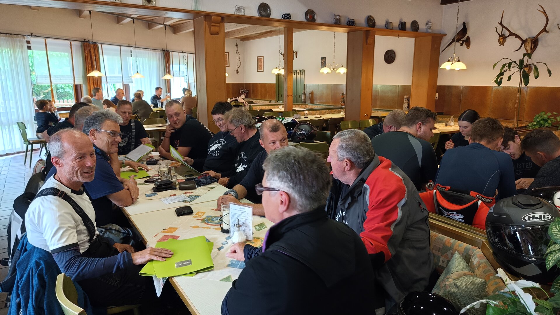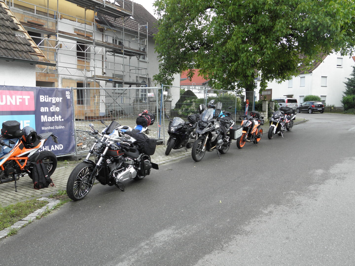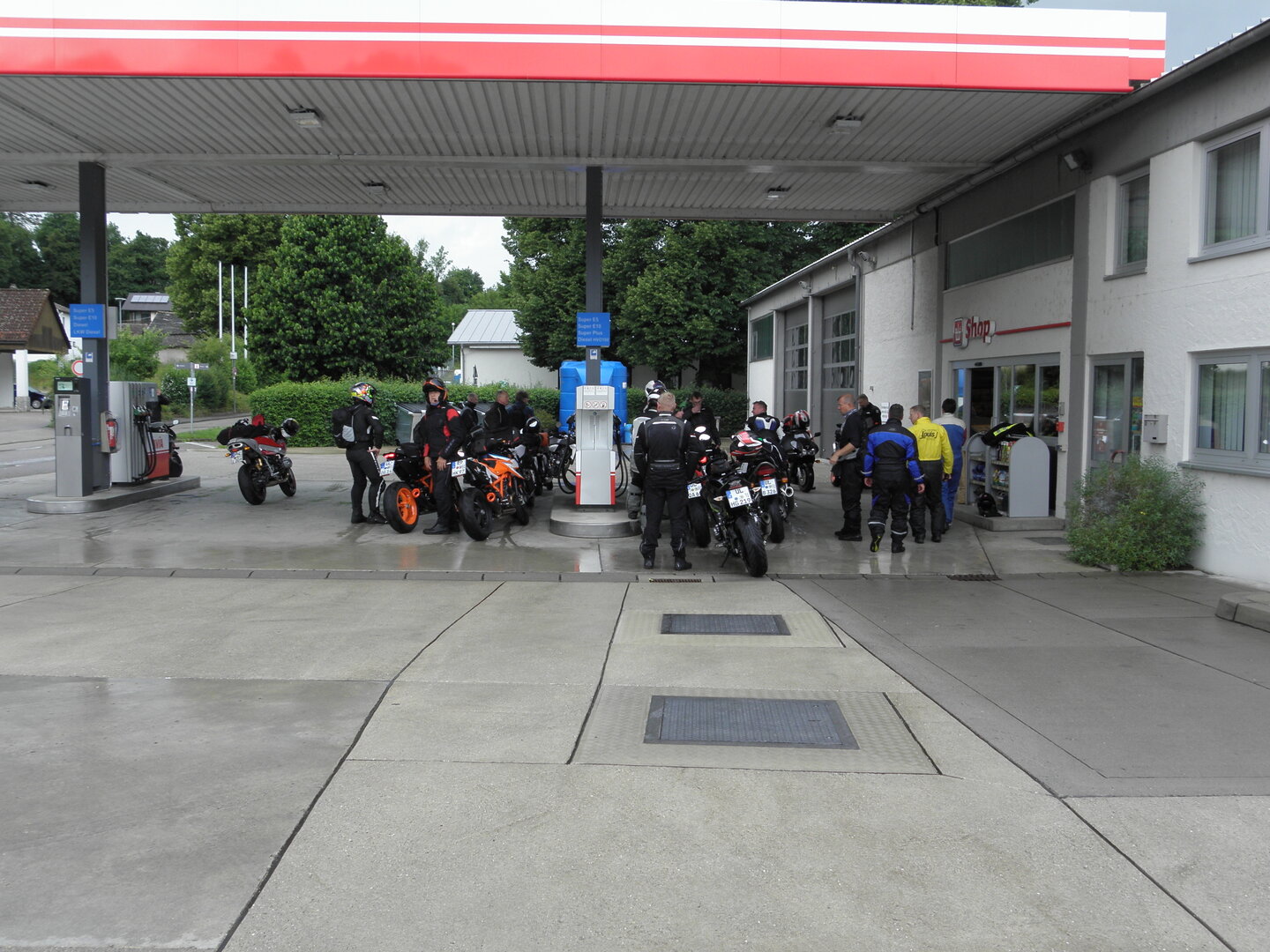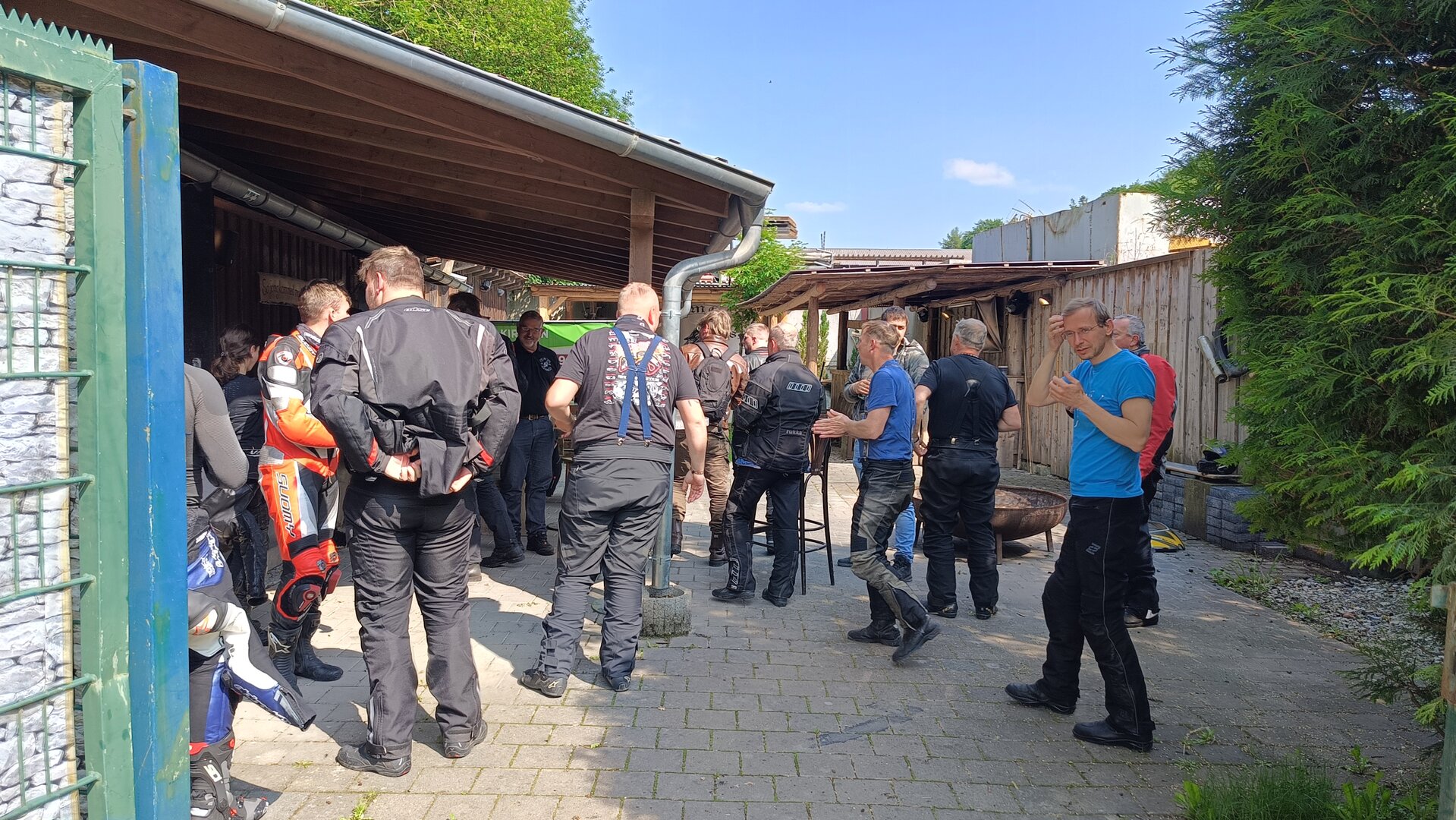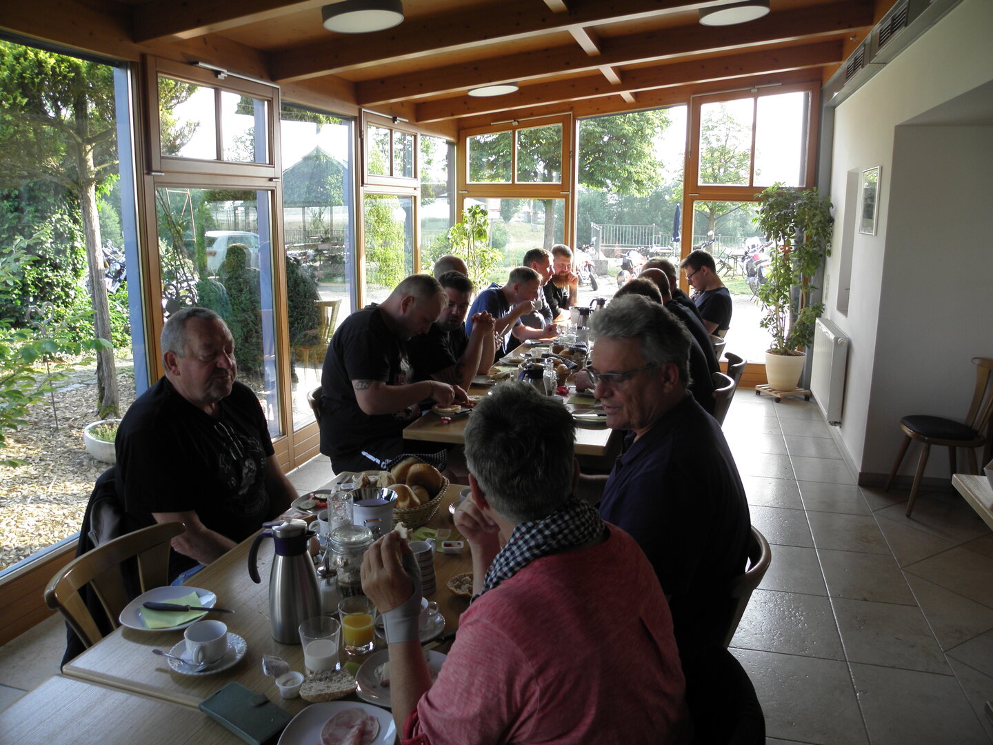 Am 7. Juni gings wieder los es stand die Pfingstausfahrt auf dem Programm. Ziel war dieses mal der Gasthof "Zu den drei Heiligen " in Dietfurt an der Altmühl. Bei durchwachsenem Wetter gings morgens mit 23 Motorräder los. Die Tour ging über Blaubeuren, Dornstadt, Beimerstetten, Heuchlingen, Hermaringen, Sachsenhausen, Dischingen, Amerdingen, Harburg, Flotzheim, nach Pappenheim wo getankt wurde. Dort fing es an zu regnen und die Strecke über Eichtätt, Kinding, Beilngries nach Griesstetten wurde im Regen absolviert. Zum Teil Nass angekommen wurden die Zimmer bezogen, warm geduscht und sich erst einmal ein kühles Blondes gegönnt. Nach einem tollen Essen wollten einige noch auf einFest in der Nähe und organisierte ein Großraumtaxi. Man staunte nicht schlecht als statt dem Taxi ein Reisebus ankam. Mit dem fuhren einige aufs Fest, das ältere Semester blieb im Gasthof und lies es dort ausklingen. Nach reichhaltigem Frühstück und abkühlung in der Altmühl ging es auf zu einer Rundtour Man fuhr über Beratzhausen, Burglengenfeld, Amberg. Kurz vor Amberg mussten wir zwecks Unwetter unterstehen. Von oben trocken gings weiter nach Hirschau, Hahnbach, Kalchsreuth, nach Pruihausen wo im Gasthof Jägerheim Mittag gemacht wurde. Nach gutem Essen fuhr man dann über Neuhaus an der Pegnitz Richtung Happurg. In der Mitte der Strecke wurden wir noch von dem Verkehrszug der Polizei angehalten, Fahrzeugkontrolle usw. stand auf dem Plan. Wir waren wahrscheinlich die einzigen Motorradfahrer an diesem Tag da sonst bei diesem Wetter keiner sein Bike herausholte. Nach einer halben Stunde ging wieder weiter nach Laaber, Mittersthal, Stauferbuch, zurück nach Griesstetten wo man den Abend bei Speis und Trank ausklingen lies. Einige machten noch einen Spaziergang zur Wahlfahrtskirche "zu den drei elend Heiligen". Gestärkt am morgen bei besserem Wetter gings zurück über Beilngries, Weißenburg in Bayern, Wassertrüdingen, Unterschneidheim, Oberkochen, Lonsee, Blaubeuren zurück ins Clubheim wo es noch Kaffee und Kuchen gab. Es waren mal wieder 3 tolle Tage bis nächstes Jahr.