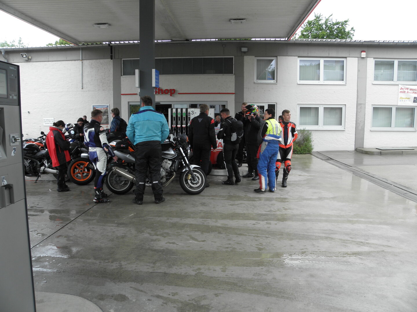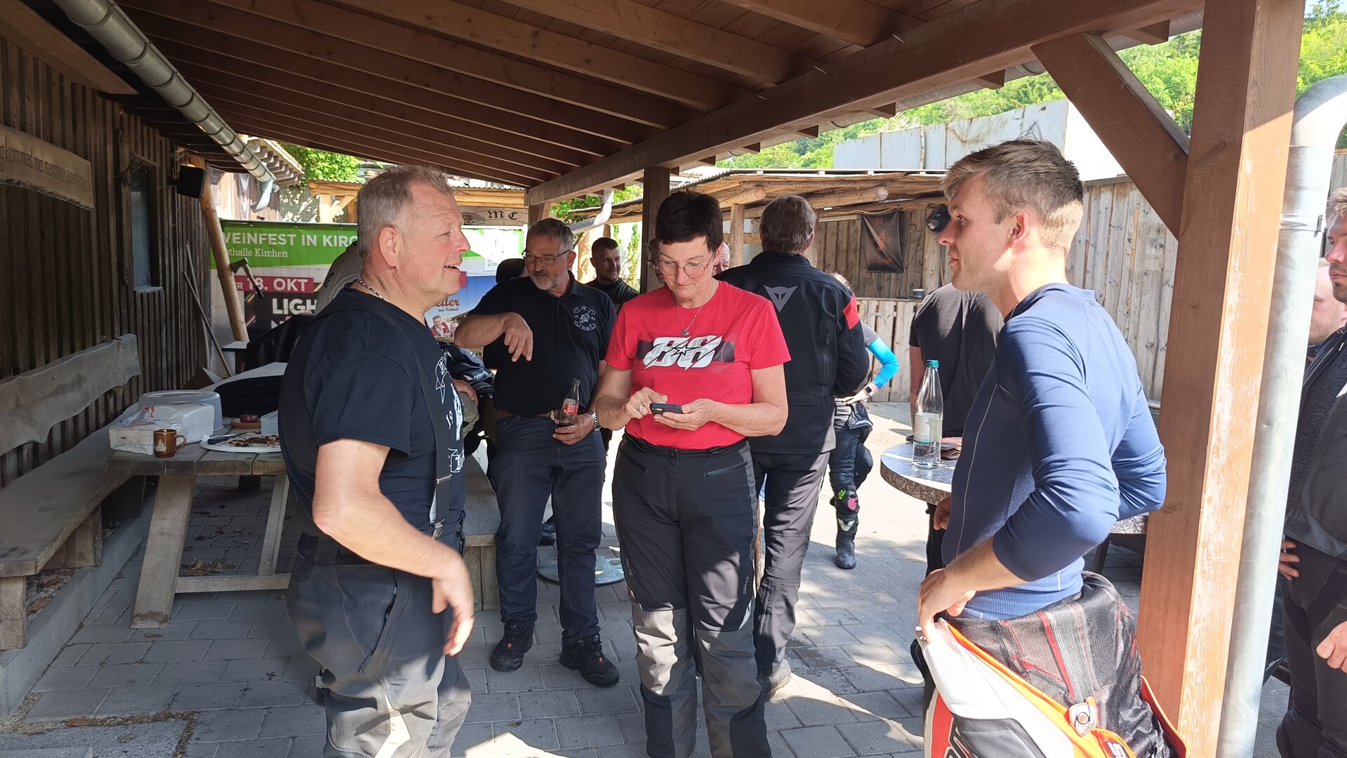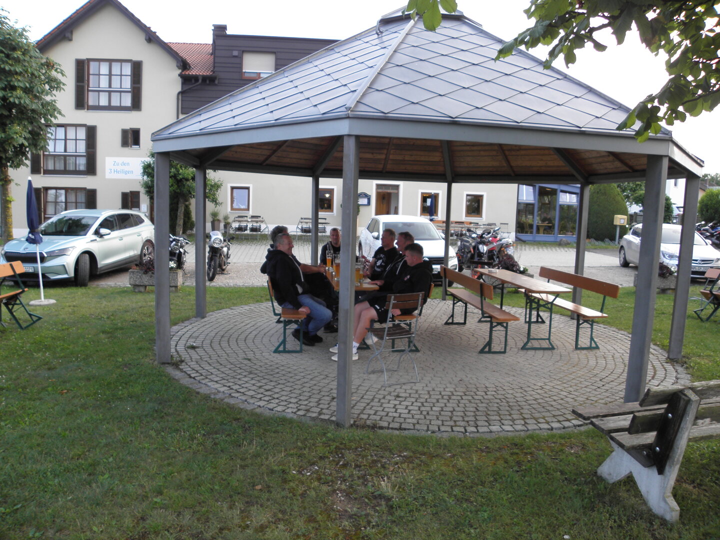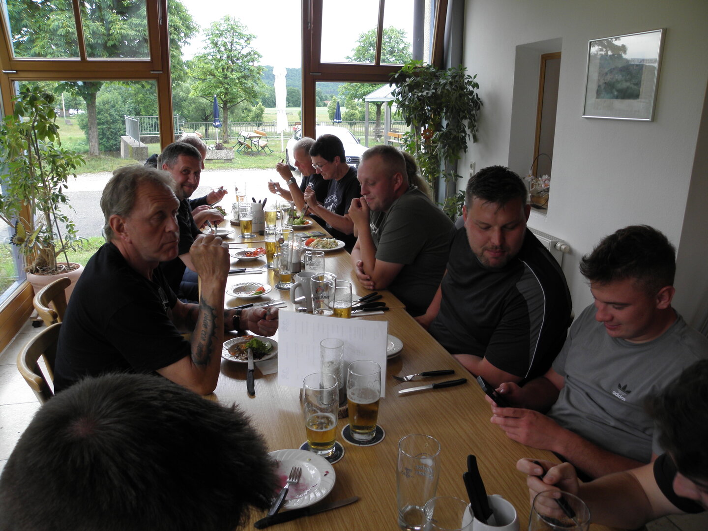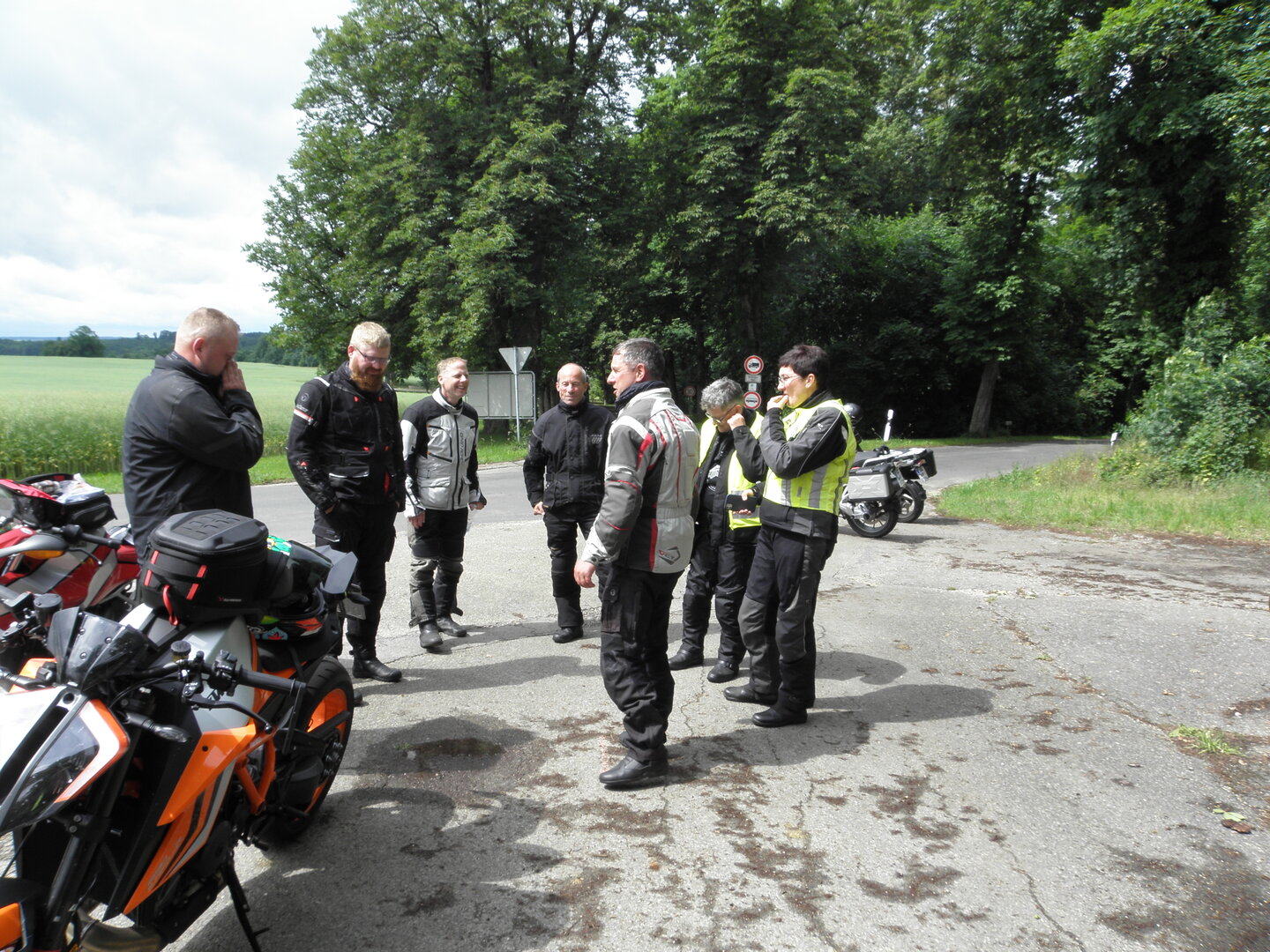 Am 7. Juni gings wieder los es stand die Pfingstausfahrt auf dem Programm. Ziel war dieses mal der Gasthof "Zu den drei Heiligen " in Dietfurt an der Altmühl. Bei durchwachsenem Wetter gings morgens mit 23 Motorräder los. Die Tour ging über Blaubeuren, Dornstadt, Beimerstetten, Heuchlingen, Hermaringen, Sachsenhausen, Dischingen, Amerdingen, Harburg, Flotzheim, nach Pappenheim wo getankt wurde. Dort fing es an zu regnen und die Strecke über Eichtätt, Kinding, Beilngries nach Griesstetten wurde im Regen absolviert. Zum Teil Nass angekommen wurden die Zimmer bezogen, warm geduscht und sich erst einmal ein kühles Blondes gegönnt. Nach einem tollen Essen wollten einige noch auf einFest in der Nähe und organisierte ein Großraumtaxi. Man staunte nicht schlecht als statt dem Taxi ein Reisebus ankam. Mit dem fuhren einige aufs Fest, das ältere Semester blieb im Gasthof und lies es dort ausklingen. Nach reichhaltigem Frühstück und abkühlung in der Altmühl ging es auf zu einer Rundtour Man fuhr über Beratzhausen, Burglengenfeld, Amberg. Kurz vor Amberg mussten wir zwecks Unwetter unterstehen. Von oben trocken gings weiter nach Hirschau, Hahnbach, Kalchsreuth, nach Pruihausen wo im Gasthof Jägerheim Mittag gemacht wurde. Nach gutem Essen fuhr man dann über Neuhaus an der Pegnitz Richtung Happurg. In der Mitte der Strecke wurden wir noch von dem Verkehrszug der Polizei angehalten, Fahrzeugkontrolle usw. stand auf dem Plan. Wir waren wahrscheinlich die einzigen Motorradfahrer an diesem Tag da sonst bei diesem Wetter keiner sein Bike herausholte. Nach einer halben Stunde ging wieder weiter nach Laaber, Mittersthal, Stauferbuch, zurück nach Griesstetten wo man den Abend bei Speis und Trank ausklingen lies. Einige machten noch einen Spaziergang zur Wahlfahrtskirche "zu den drei elend Heiligen". Gestärkt am morgen bei besserem Wetter gings zurück über Beilngries, Weißenburg in Bayern, Wassertrüdingen, Unterschneidheim, Oberkochen, Lonsee, Blaubeuren zurück ins Clubheim wo es noch Kaffee und Kuchen gab. Es waren mal wieder 3 tolle Tage bis nächstes Jahr.