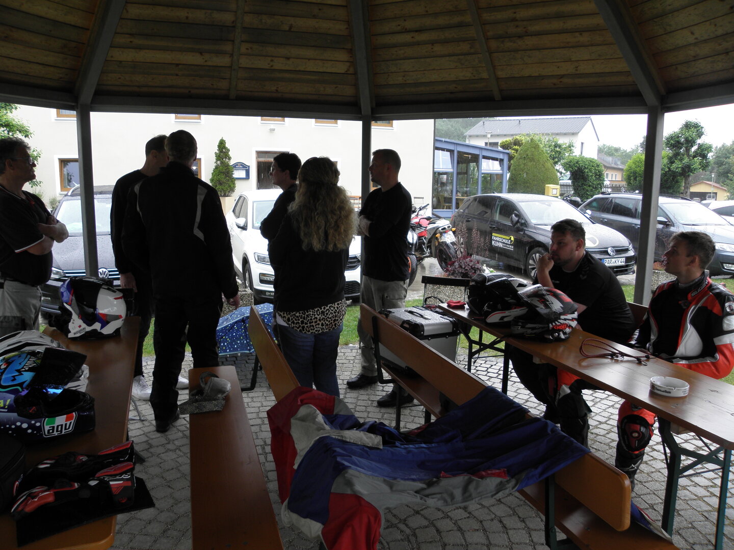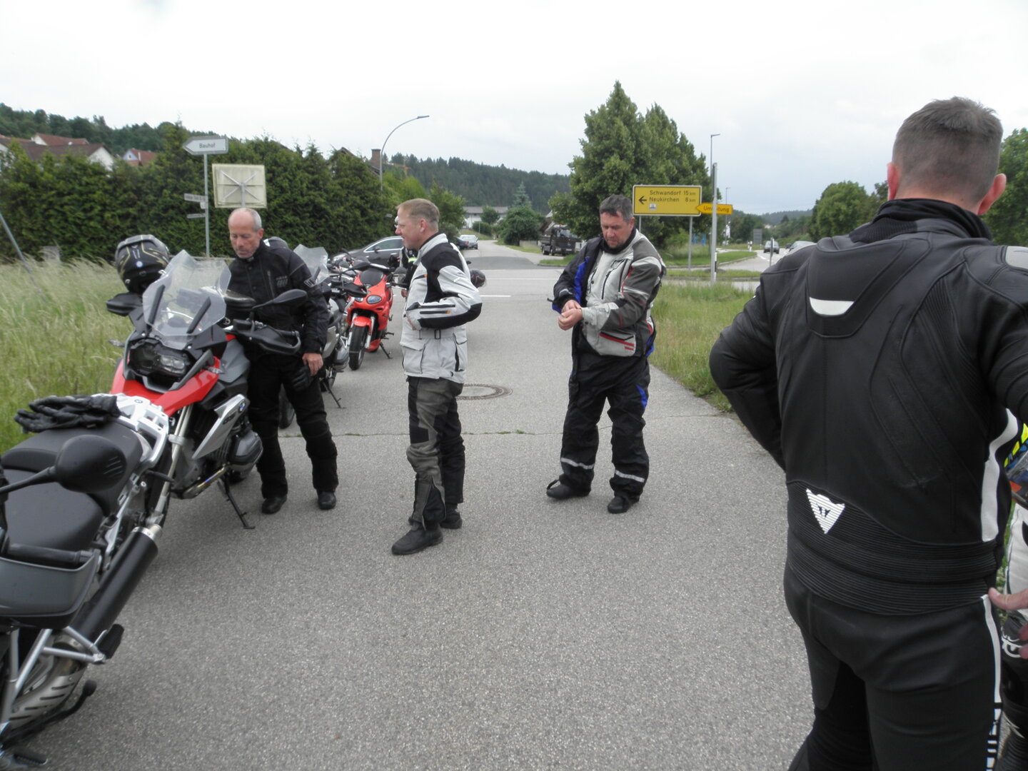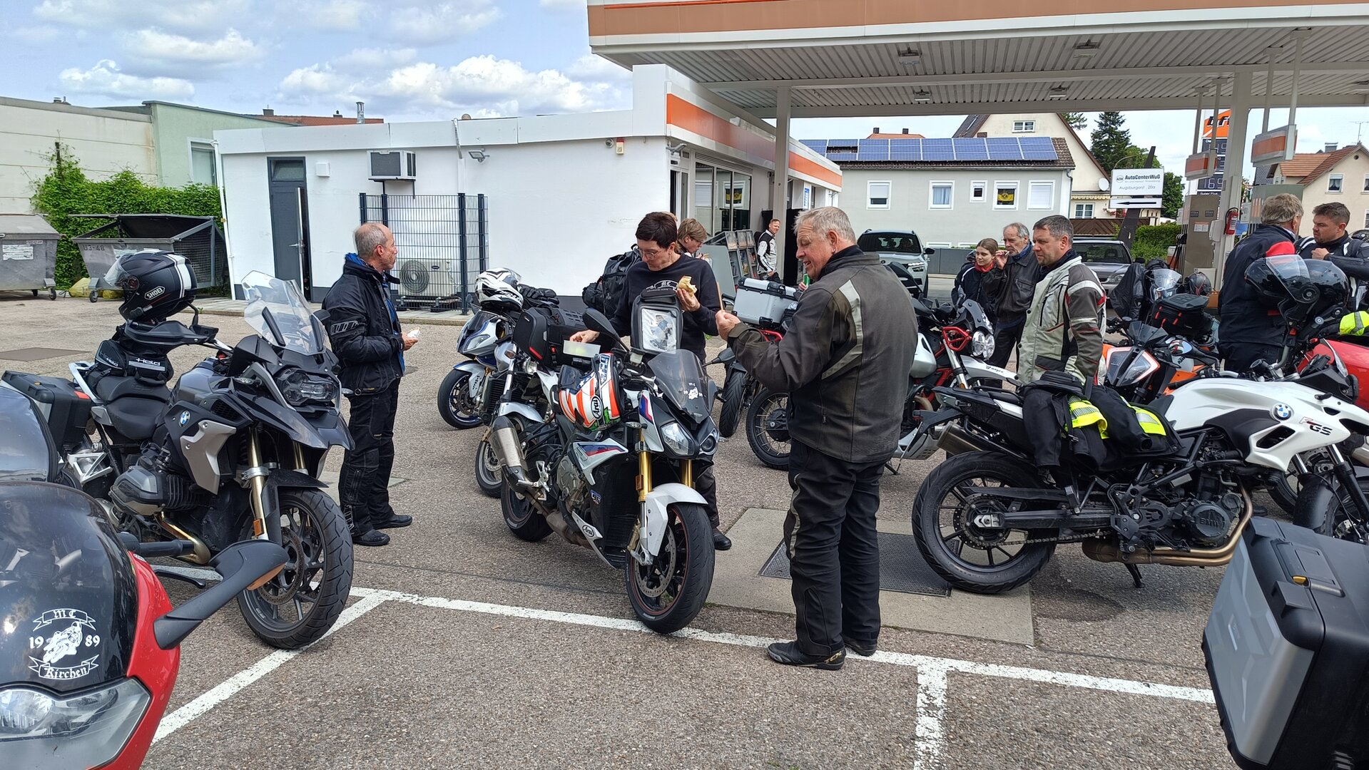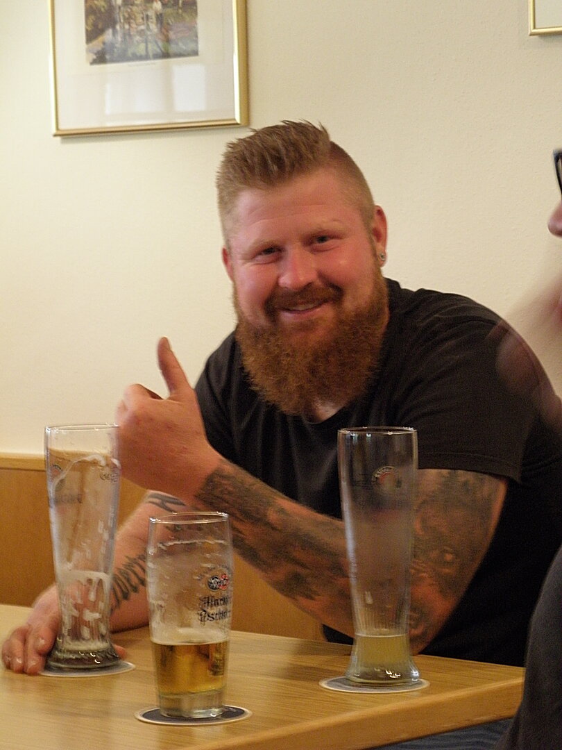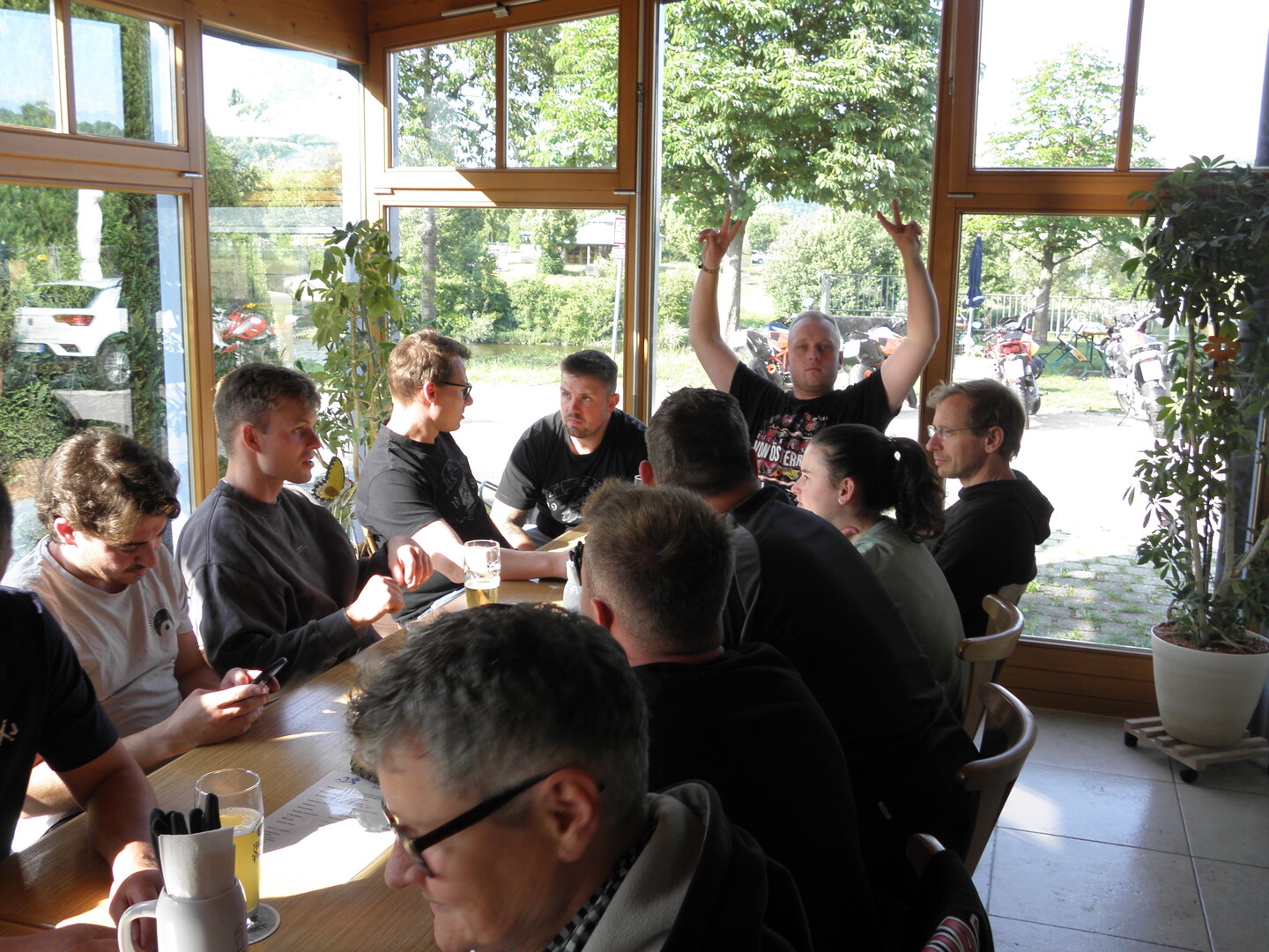 Am 7. Juni gings wieder los es stand die Pfingstausfahrt auf dem Programm. Ziel war dieses mal der Gasthof "Zu den drei Heiligen " in Dietfurt an der Altmühl. Bei durchwachsenem Wetter gings morgens mit 23 Motorräder los. Die Tour ging über Blaubeuren, Dornstadt, Beimerstetten, Heuchlingen, Hermaringen, Sachsenhausen, Dischingen, Amerdingen, Harburg, Flotzheim, nach Pappenheim wo getankt wurde. Dort fing es an zu regnen und die Strecke über Eichtätt, Kinding, Beilngries nach Griesstetten wurde im Regen absolviert. Zum Teil Nass angekommen wurden die Zimmer bezogen, warm geduscht und sich erst einmal ein kühles Blondes gegönnt. Nach einem tollen Essen wollten einige noch auf einFest in der Nähe und organisierte ein Großraumtaxi. Man staunte nicht schlecht als statt dem Taxi ein Reisebus ankam. Mit dem fuhren einige aufs Fest, das ältere Semester blieb im Gasthof und lies es dort ausklingen. Nach reichhaltigem Frühstück und abkühlung in der Altmühl ging es auf zu einer Rundtour Man fuhr über Beratzhausen, Burglengenfeld, Amberg. Kurz vor Amberg mussten wir zwecks Unwetter unterstehen. Von oben trocken gings weiter nach Hirschau, Hahnbach, Kalchsreuth, nach Pruihausen wo im Gasthof Jägerheim Mittag gemacht wurde. Nach gutem Essen fuhr man dann über Neuhaus an der Pegnitz Richtung Happurg. In der Mitte der Strecke wurden wir noch von dem Verkehrszug der Polizei angehalten, Fahrzeugkontrolle usw. stand auf dem Plan. Wir waren wahrscheinlich die einzigen Motorradfahrer an diesem Tag da sonst bei diesem Wetter keiner sein Bike herausholte. Nach einer halben Stunde ging wieder weiter nach Laaber, Mittersthal, Stauferbuch, zurück nach Griesstetten wo man den Abend bei Speis und Trank ausklingen lies. Einige machten noch einen Spaziergang zur Wahlfahrtskirche "zu den drei elend Heiligen". Gestärkt am morgen bei besserem Wetter gings zurück über Beilngries, Weißenburg in Bayern, Wassertrüdingen, Unterschneidheim, Oberkochen, Lonsee, Blaubeuren zurück ins Clubheim wo es noch Kaffee und Kuchen gab. Es waren mal wieder 3 tolle Tage bis nächstes Jahr.