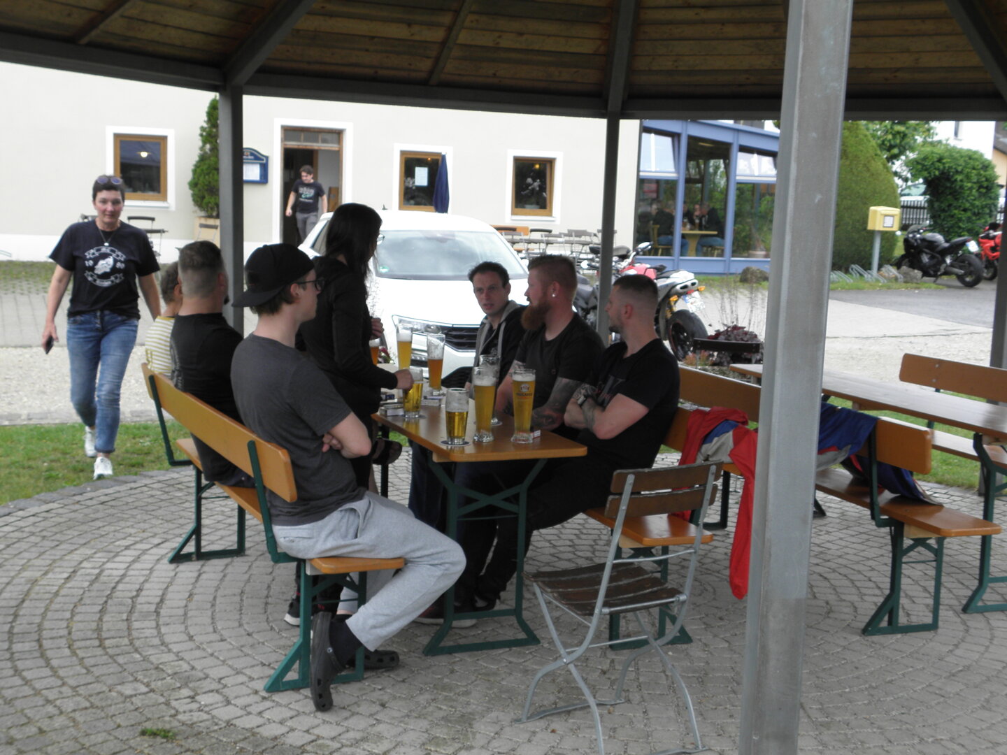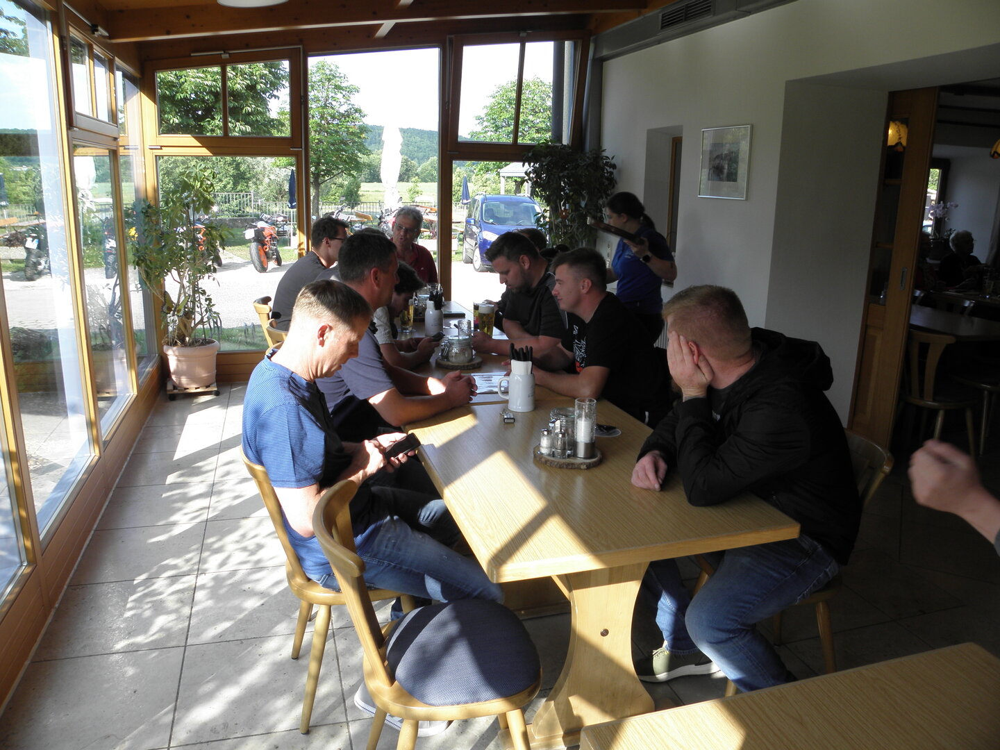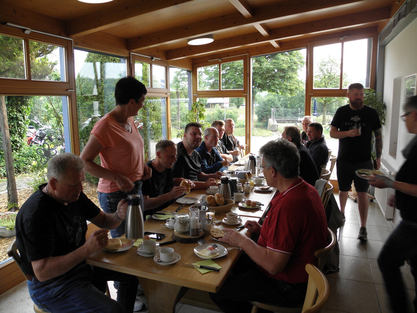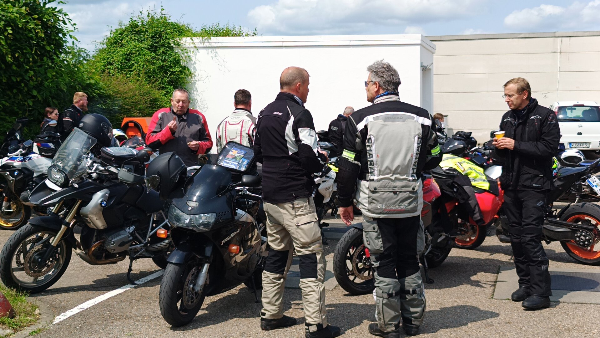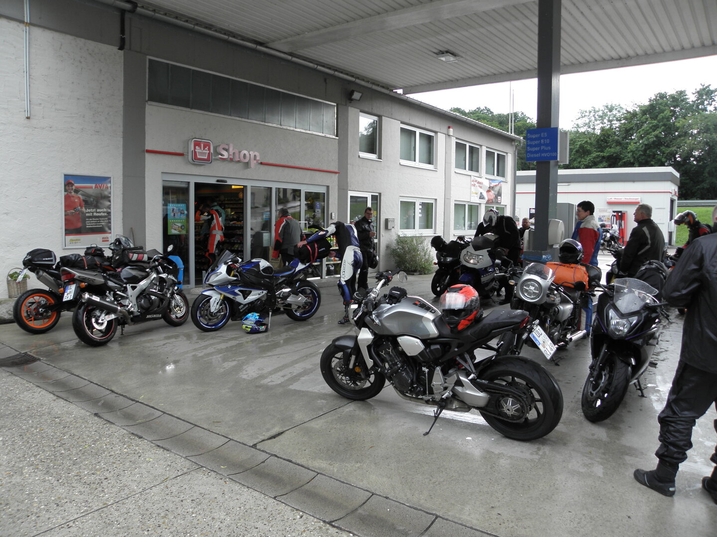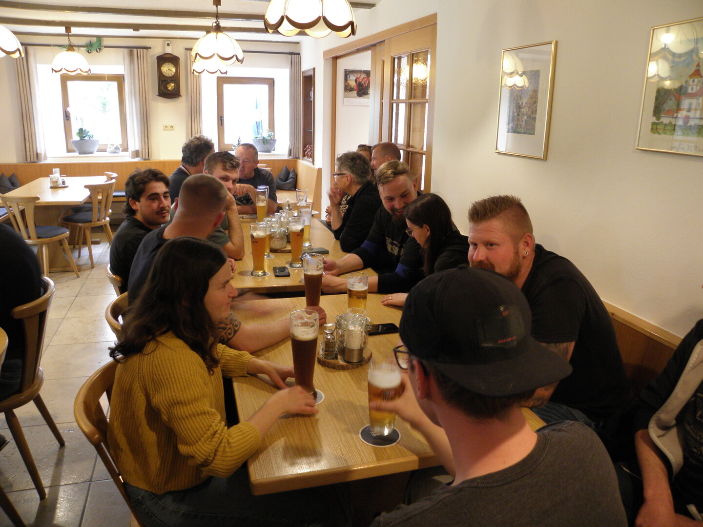 Am 7. Juni gings wieder los es stand die Pfingstausfahrt auf dem Programm. Ziel war dieses mal der Gasthof "Zu den drei Heiligen " in Dietfurt an der Altmühl. Bei durchwachsenem Wetter gings morgens mit 23 Motorräder los. Die Tour ging über Blaubeuren, Dornstadt, Beimerstetten, Heuchlingen, Hermaringen, Sachsenhausen, Dischingen, Amerdingen, Harburg, Flotzheim, nach Pappenheim wo getankt wurde. Dort fing es an zu regnen und die Strecke über Eichtätt, Kinding, Beilngries nach Griesstetten wurde im Regen absolviert. Zum Teil Nass angekommen wurden die Zimmer bezogen, warm geduscht und sich erst einmal ein kühles Blondes gegönnt. Nach einem tollen Essen wollten einige noch auf einFest in der Nähe und organisierte ein Großraumtaxi. Man staunte nicht schlecht als statt dem Taxi ein Reisebus ankam. Mit dem fuhren einige aufs Fest, das ältere Semester blieb im Gasthof und lies es dort ausklingen. Nach reichhaltigem Frühstück und abkühlung in der Altmühl ging es auf zu einer Rundtour Man fuhr über Beratzhausen, Burglengenfeld, Amberg. Kurz vor Amberg mussten wir zwecks Unwetter unterstehen. Von oben trocken gings weiter nach Hirschau, Hahnbach, Kalchsreuth, nach Pruihausen wo im Gasthof Jägerheim Mittag gemacht wurde. Nach gutem Essen fuhr man dann über Neuhaus an der Pegnitz Richtung Happurg. In der Mitte der Strecke wurden wir noch von dem Verkehrszug der Polizei angehalten, Fahrzeugkontrolle usw. stand auf dem Plan. Wir waren wahrscheinlich die einzigen Motorradfahrer an diesem Tag da sonst bei diesem Wetter keiner sein Bike herausholte. Nach einer halben Stunde ging wieder weiter nach Laaber, Mittersthal, Stauferbuch, zurück nach Griesstetten wo man den Abend bei Speis und Trank ausklingen lies. Einige machten noch einen Spaziergang zur Wahlfahrtskirche "zu den drei elend Heiligen". Gestärkt am morgen bei besserem Wetter gings zurück über Beilngries, Weißenburg in Bayern, Wassertrüdingen, Unterschneidheim, Oberkochen, Lonsee, Blaubeuren zurück ins Clubheim wo es noch Kaffee und Kuchen gab. Es waren mal wieder 3 tolle Tage bis nächstes Jahr.