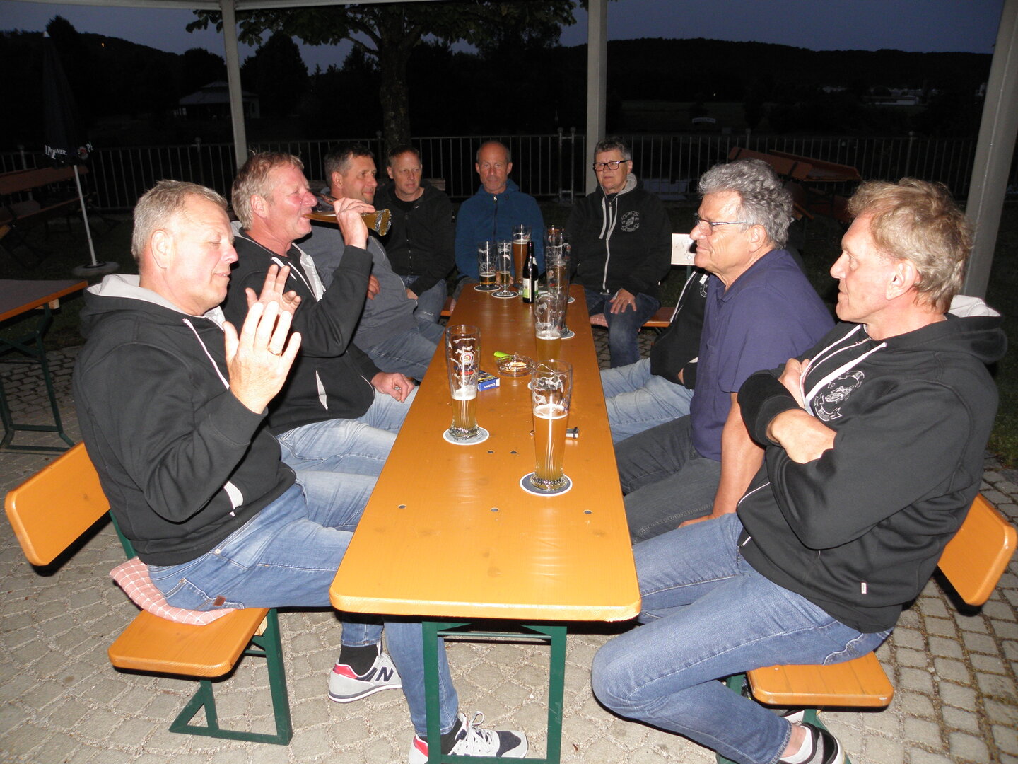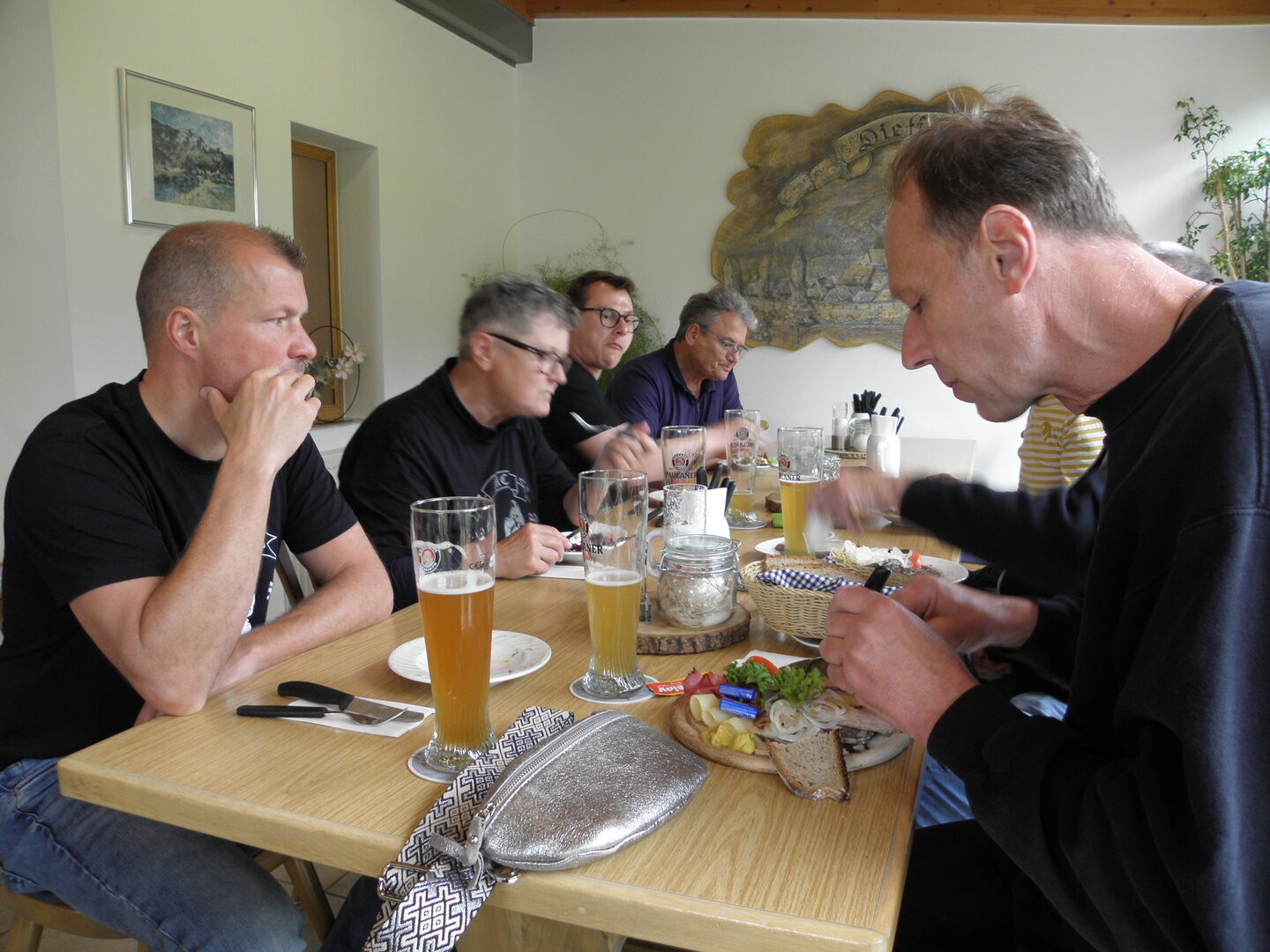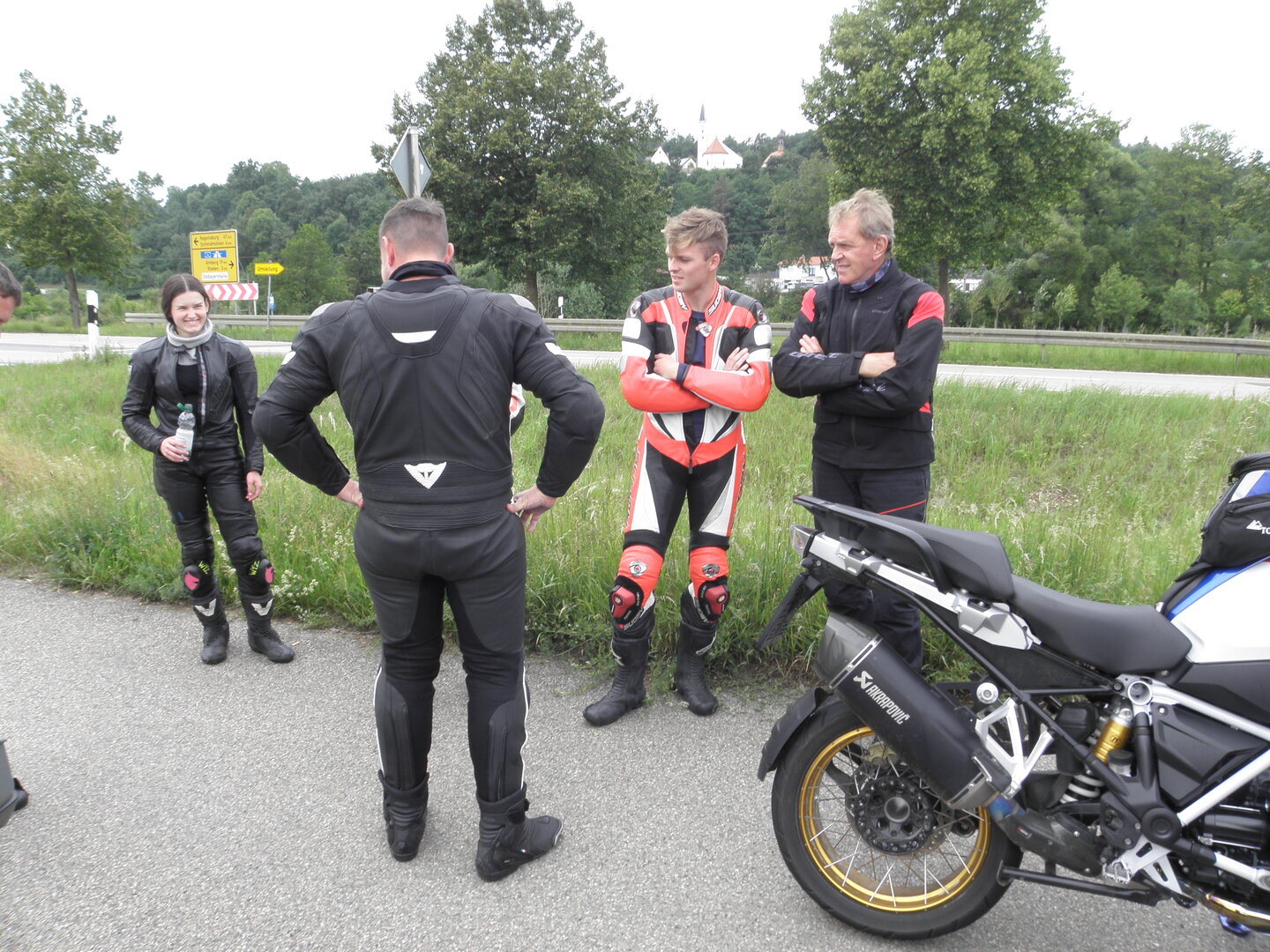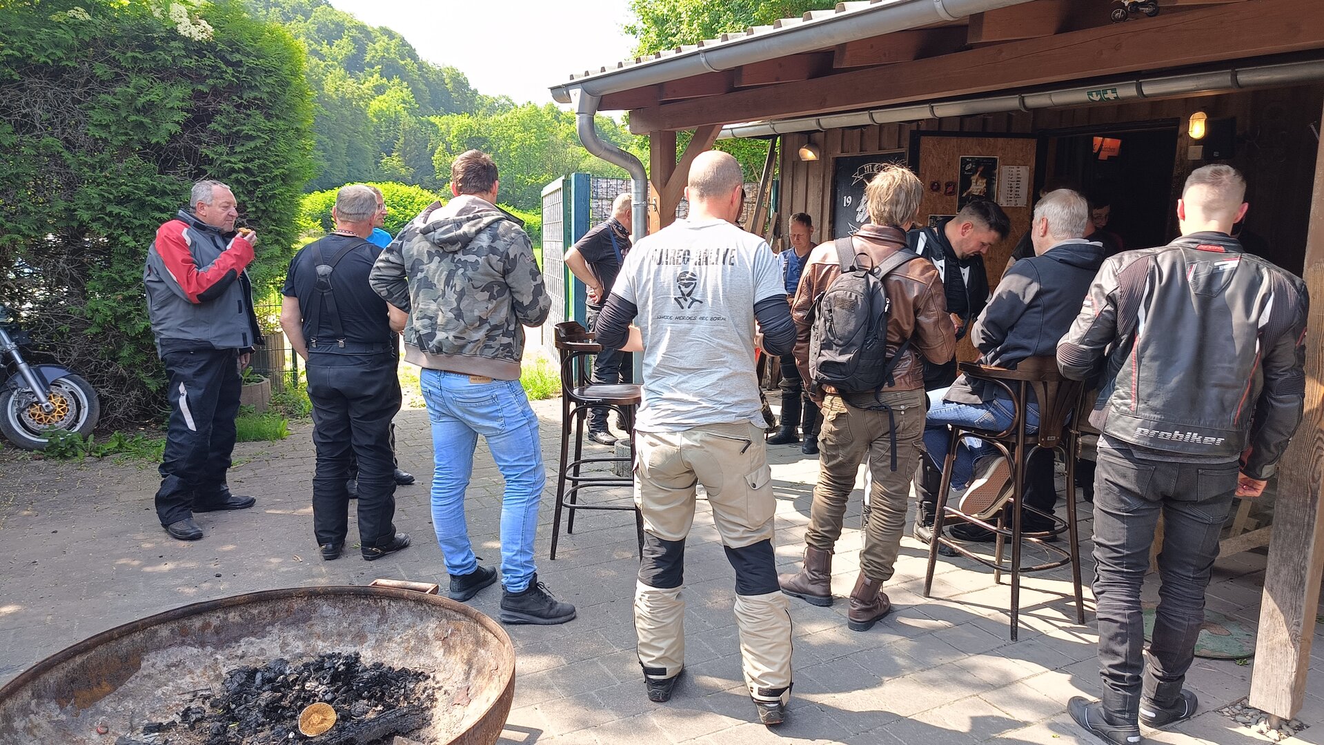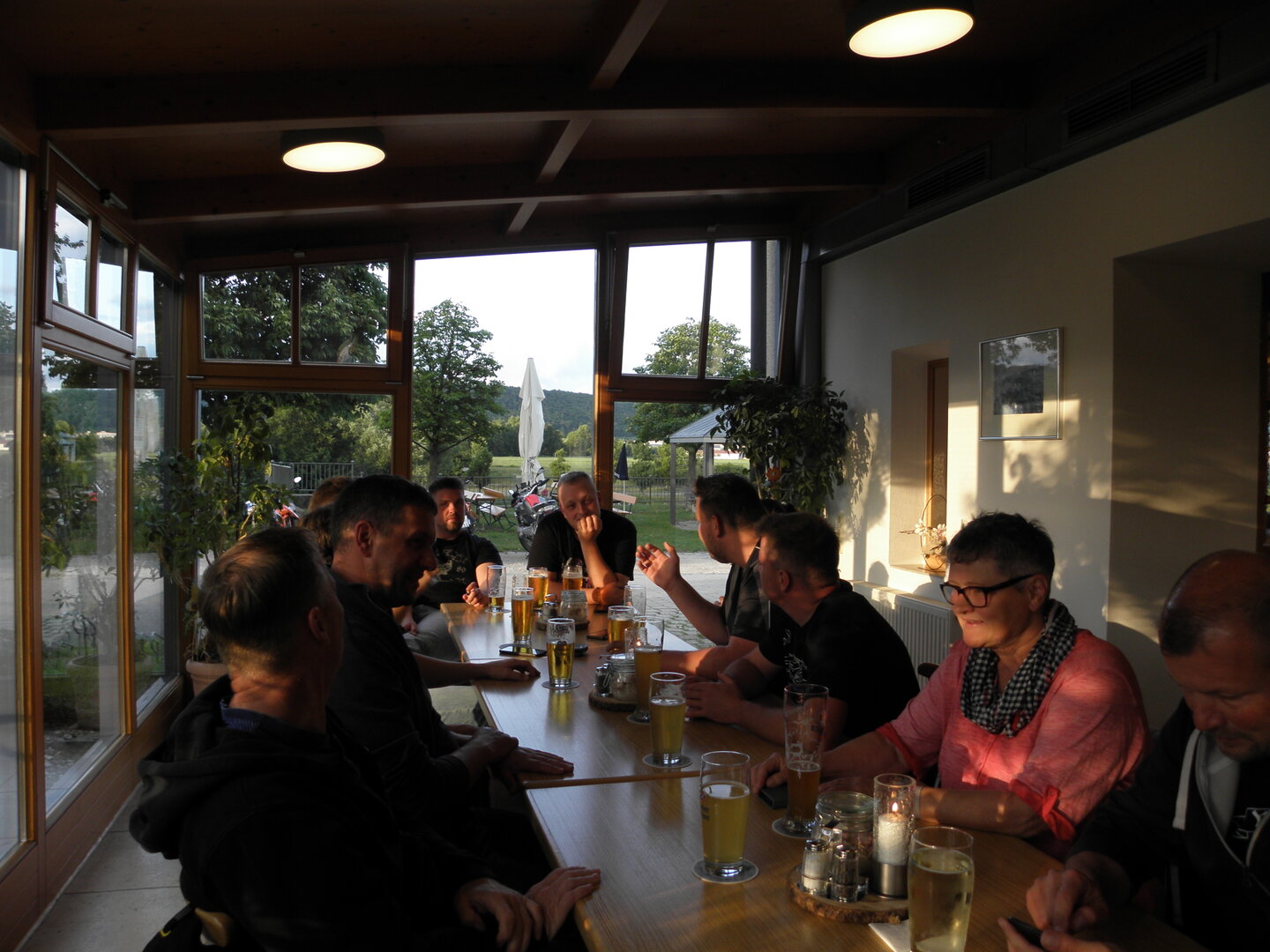 Am 7. Juni gings wieder los es stand die Pfingstausfahrt auf dem Programm. Ziel war dieses mal der Gasthof "Zu den drei Heiligen " in Dietfurt an der Altmühl. Bei durchwachsenem Wetter gings morgens mit 23 Motorräder los. Die Tour ging über Blaubeuren, Dornstadt, Beimerstetten, Heuchlingen, Hermaringen, Sachsenhausen, Dischingen, Amerdingen, Harburg, Flotzheim, nach Pappenheim wo getankt wurde. Dort fing es an zu regnen und die Strecke über Eichtätt, Kinding, Beilngries nach Griesstetten wurde im Regen absolviert. Zum Teil Nass angekommen wurden die Zimmer bezogen, warm geduscht und sich erst einmal ein kühles Blondes gegönnt. Nach einem tollen Essen wollten einige noch auf einFest in der Nähe und organisierte ein Großraumtaxi. Man staunte nicht schlecht als statt dem Taxi ein Reisebus ankam. Mit dem fuhren einige aufs Fest, das ältere Semester blieb im Gasthof und lies es dort ausklingen. Nach reichhaltigem Frühstück und abkühlung in der Altmühl ging es auf zu einer Rundtour Man fuhr über Beratzhausen, Burglengenfeld, Amberg. Kurz vor Amberg mussten wir zwecks Unwetter unterstehen. Von oben trocken gings weiter nach Hirschau, Hahnbach, Kalchsreuth, nach Pruihausen wo im Gasthof Jägerheim Mittag gemacht wurde. Nach gutem Essen fuhr man dann über Neuhaus an der Pegnitz Richtung Happurg. In der Mitte der Strecke wurden wir noch von dem Verkehrszug der Polizei angehalten, Fahrzeugkontrolle usw. stand auf dem Plan. Wir waren wahrscheinlich die einzigen Motorradfahrer an diesem Tag da sonst bei diesem Wetter keiner sein Bike herausholte. Nach einer halben Stunde ging wieder weiter nach Laaber, Mittersthal, Stauferbuch, zurück nach Griesstetten wo man den Abend bei Speis und Trank ausklingen lies. Einige machten noch einen Spaziergang zur Wahlfahrtskirche "zu den drei elend Heiligen". Gestärkt am morgen bei besserem Wetter gings zurück über Beilngries, Weißenburg in Bayern, Wassertrüdingen, Unterschneidheim, Oberkochen, Lonsee, Blaubeuren zurück ins Clubheim wo es noch Kaffee und Kuchen gab. Es waren mal wieder 3 tolle Tage bis nächstes Jahr.