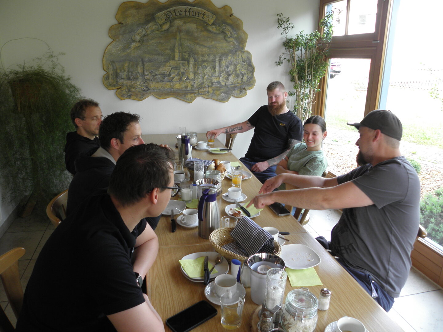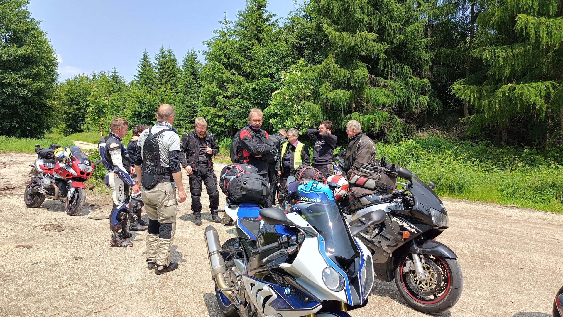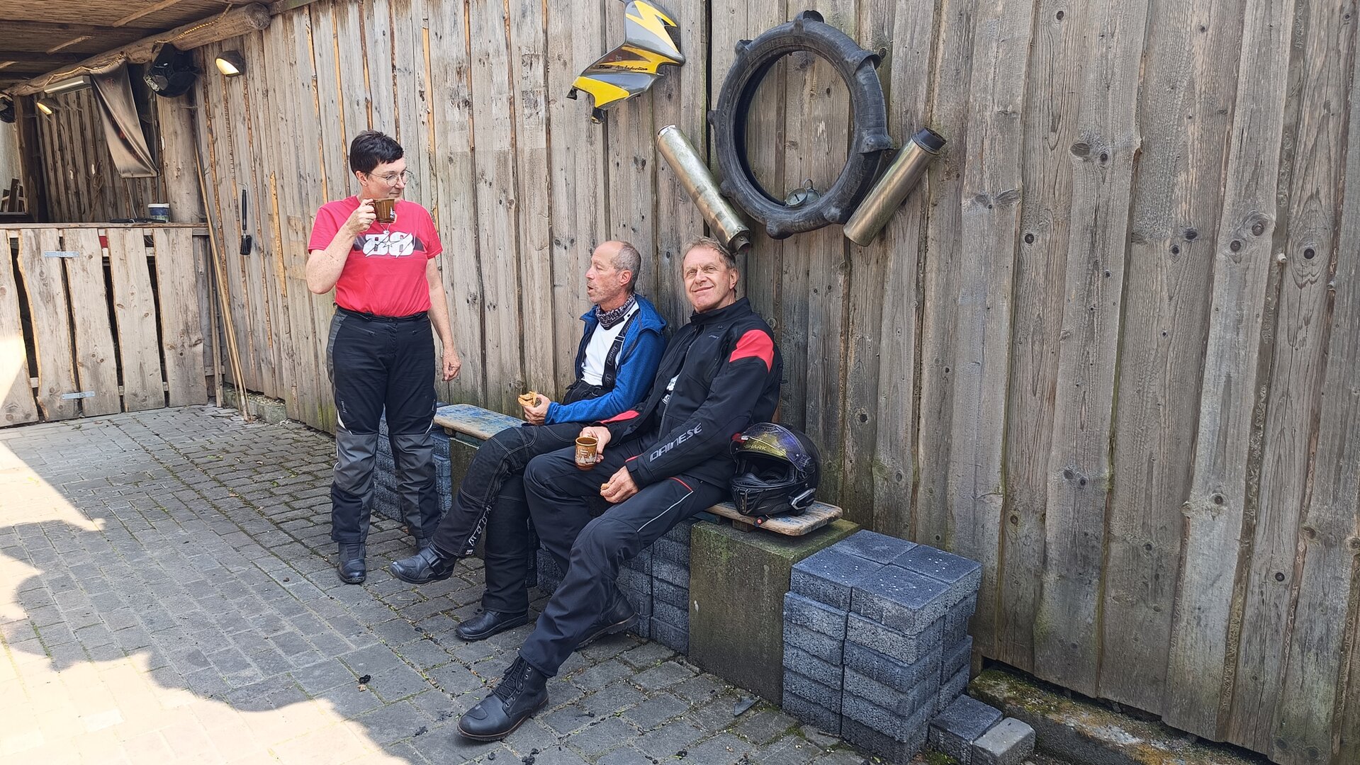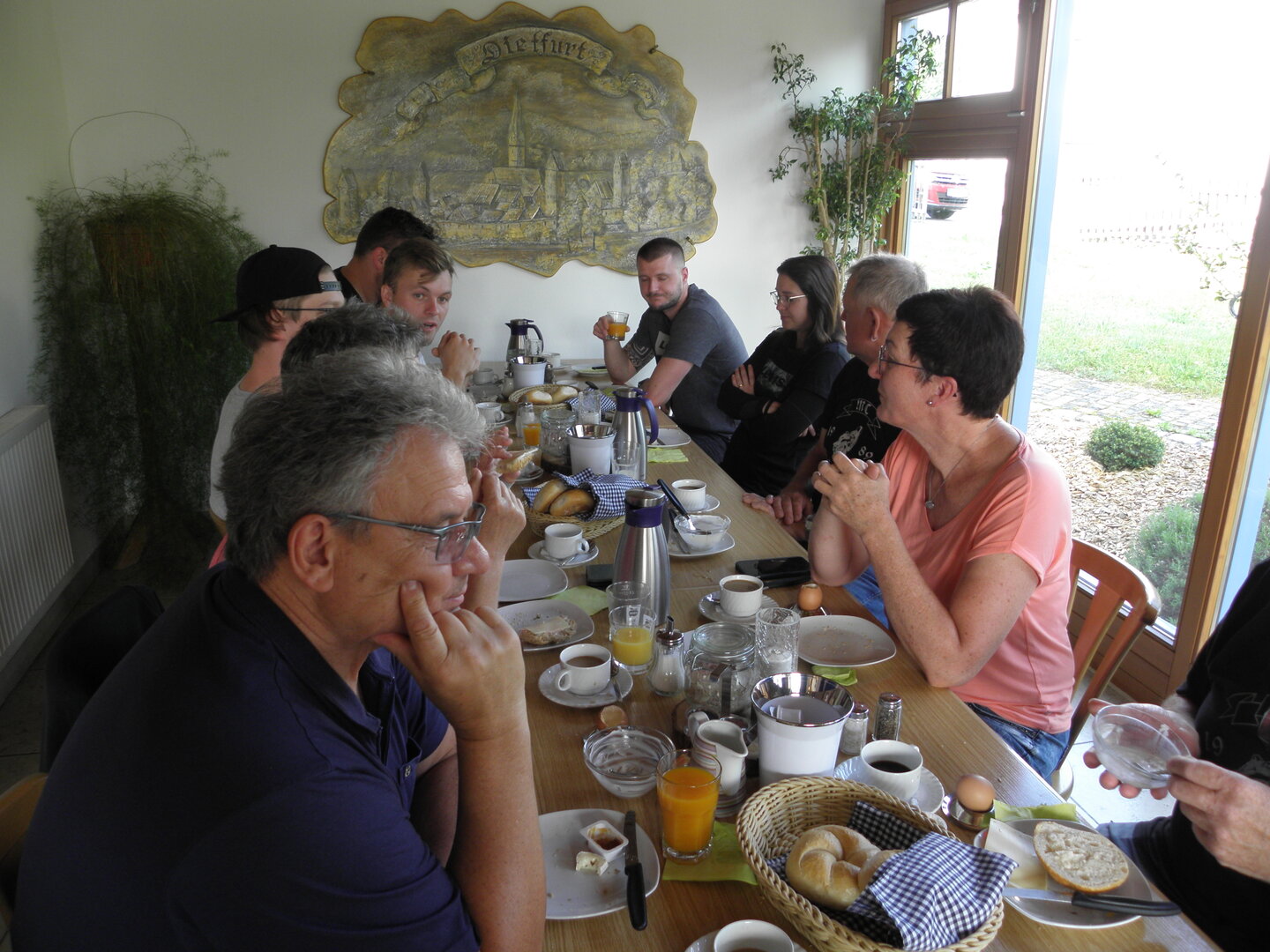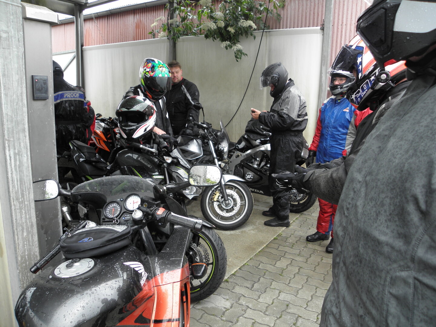 Am 7. Juni gings wieder los es stand die Pfingstausfahrt auf dem Programm. Ziel war dieses mal der Gasthof "Zu den drei Heiligen " in Dietfurt an der Altmühl. Bei durchwachsenem Wetter gings morgens mit 23 Motorräder los. Die Tour ging über Blaubeuren, Dornstadt, Beimerstetten, Heuchlingen, Hermaringen, Sachsenhausen, Dischingen, Amerdingen, Harburg, Flotzheim, nach Pappenheim wo getankt wurde. Dort fing es an zu regnen und die Strecke über Eichtätt, Kinding, Beilngries nach Griesstetten wurde im Regen absolviert. Zum Teil Nass angekommen wurden die Zimmer bezogen, warm geduscht und sich erst einmal ein kühles Blondes gegönnt. Nach einem tollen Essen wollten einige noch auf einFest in der Nähe und organisierte ein Großraumtaxi. Man staunte nicht schlecht als statt dem Taxi ein Reisebus ankam. Mit dem fuhren einige aufs Fest, das ältere Semester blieb im Gasthof und lies es dort ausklingen. Nach reichhaltigem Frühstück und abkühlung in der Altmühl ging es auf zu einer Rundtour Man fuhr über Beratzhausen, Burglengenfeld, Amberg. Kurz vor Amberg mussten wir zwecks Unwetter unterstehen. Von oben trocken gings weiter nach Hirschau, Hahnbach, Kalchsreuth, nach Pruihausen wo im Gasthof Jägerheim Mittag gemacht wurde. Nach gutem Essen fuhr man dann über Neuhaus an der Pegnitz Richtung Happurg. In der Mitte der Strecke wurden wir noch von dem Verkehrszug der Polizei angehalten, Fahrzeugkontrolle usw. stand auf dem Plan. Wir waren wahrscheinlich die einzigen Motorradfahrer an diesem Tag da sonst bei diesem Wetter keiner sein Bike herausholte. Nach einer halben Stunde ging wieder weiter nach Laaber, Mittersthal, Stauferbuch, zurück nach Griesstetten wo man den Abend bei Speis und Trank ausklingen lies. Einige machten noch einen Spaziergang zur Wahlfahrtskirche "zu den drei elend Heiligen". Gestärkt am morgen bei besserem Wetter gings zurück über Beilngries, Weißenburg in Bayern, Wassertrüdingen, Unterschneidheim, Oberkochen, Lonsee, Blaubeuren zurück ins Clubheim wo es noch Kaffee und Kuchen gab. Es waren mal wieder 3 tolle Tage bis nächstes Jahr.
